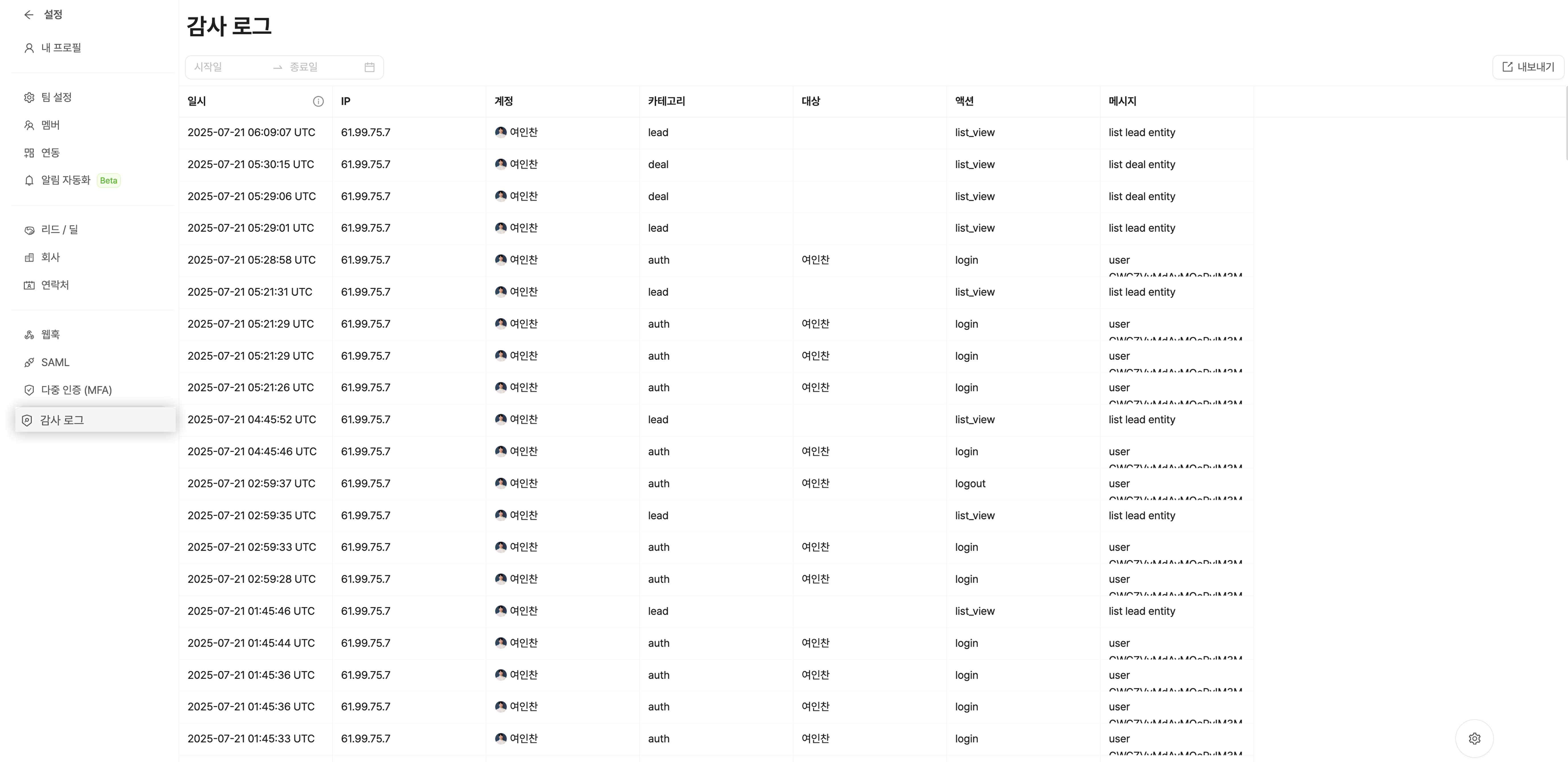 팀의 ADMIN은 설정 - '감사 로그'에서 리캐치의 리드,딜,회사의 생성/수정/삭제 내역을 확인하실 수 있습니다.