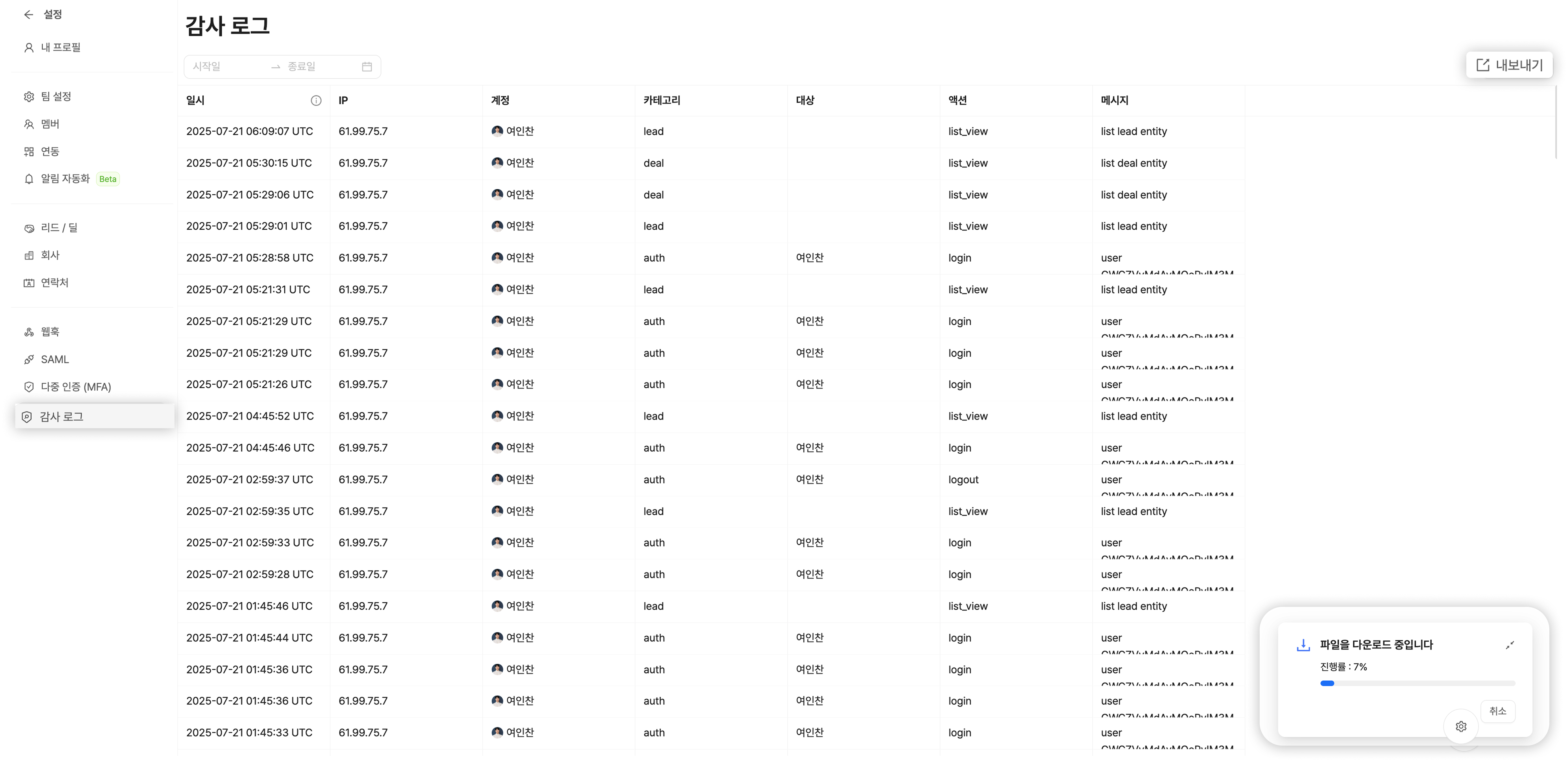 감사 로그를 CSV 파일로 다운로드할 수 있습니다.