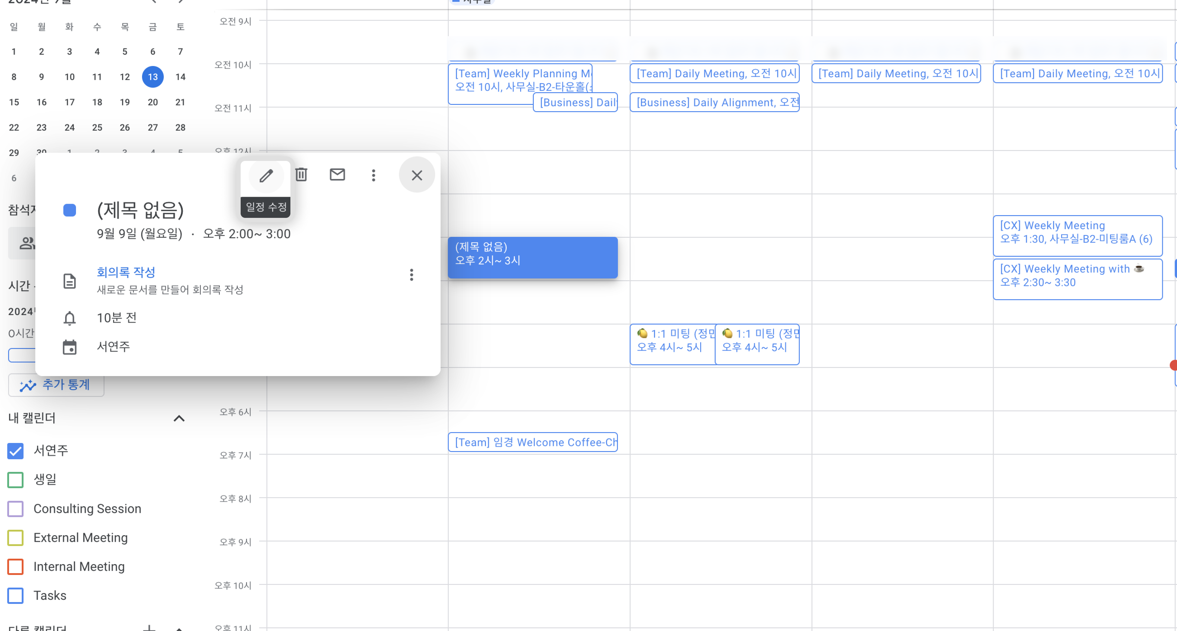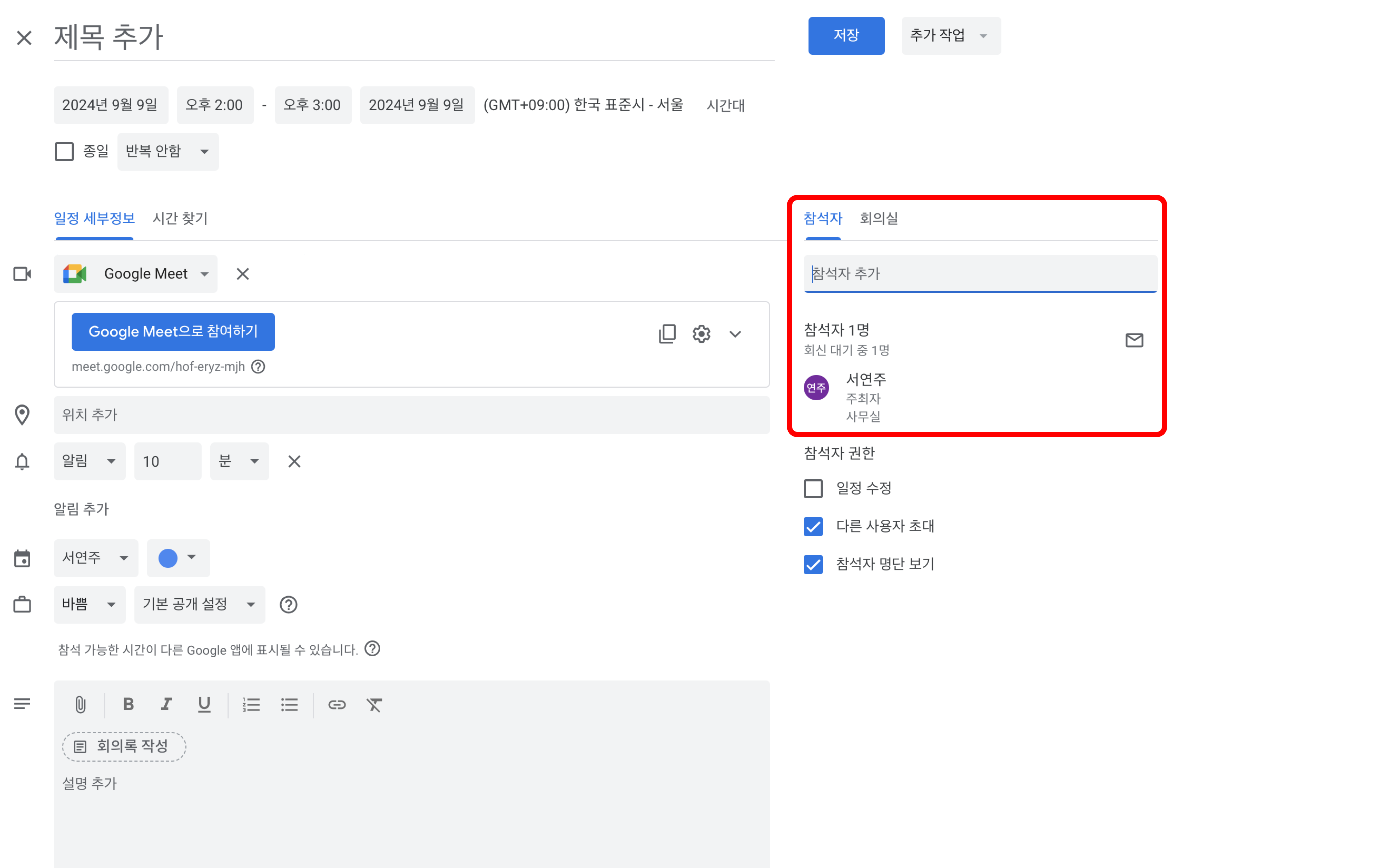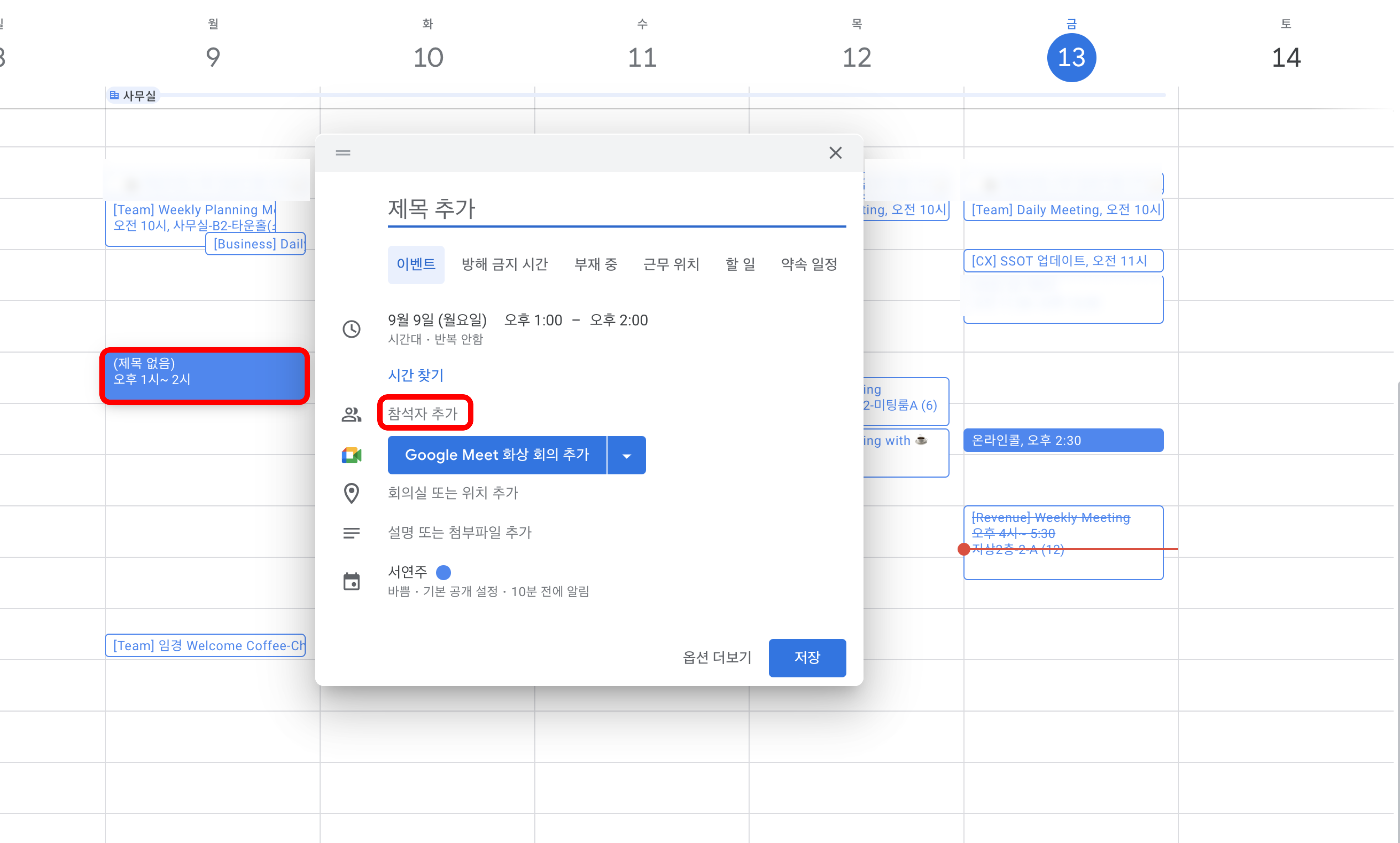 다음 사진과 같이 이벤트를 클릭하였을 때 '참석자 추가'가 나타난다면 캘린더 상에서는 빈 슬롯으로 인식됩니다. (고객이 리캐치에서 미팅 일정을 수립할 때 해당 시간을 선택할 수 있습니다.)