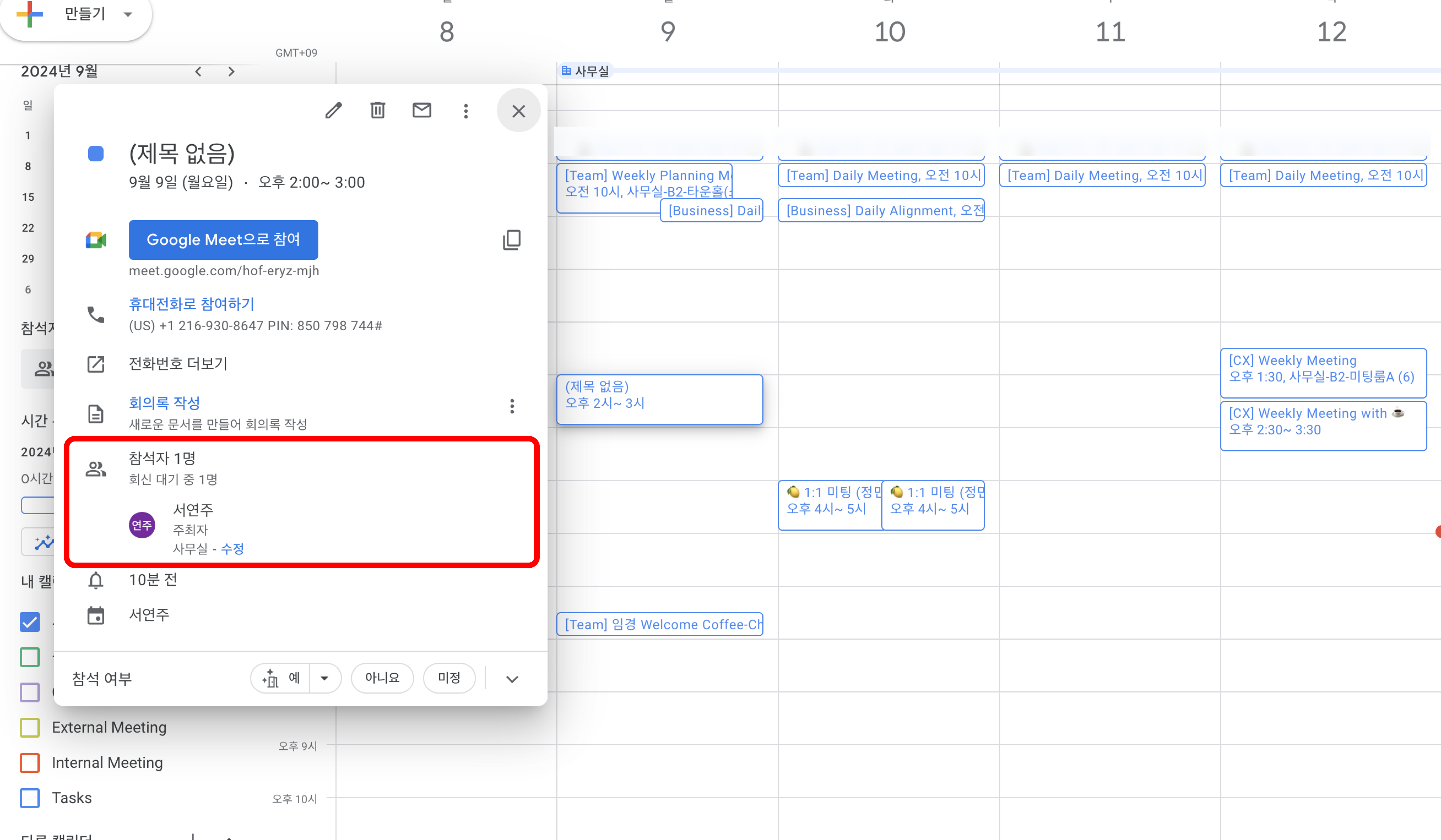 참석자가 추가되면 다음과 같이 이벤트를 클릭하였을 때 참석자를 확인할 수 있습니다.