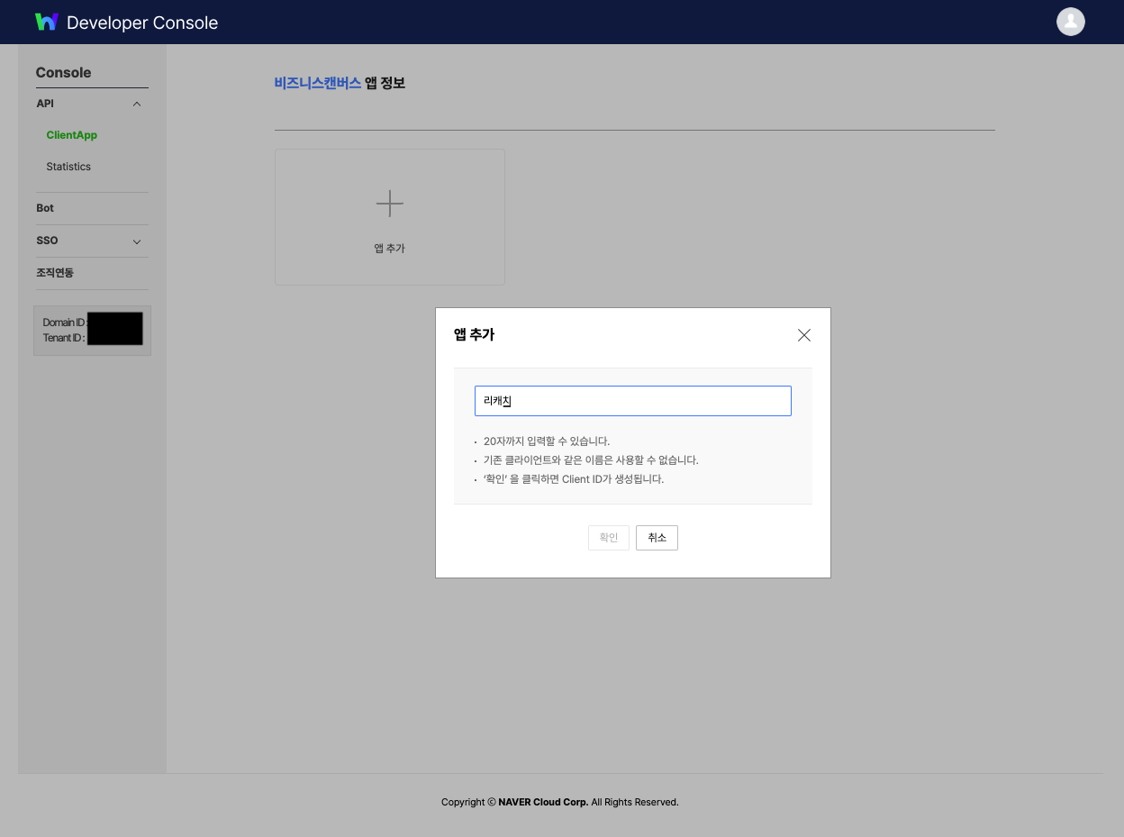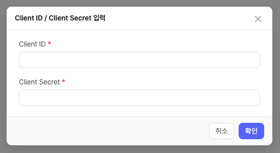 다음과 같은 모달이 뜨면 네이버웍스 Developer Console에서 Client ID와 Client Secret을 복사해서 붙여넣고 확인 버튼을 클릭합니다.
