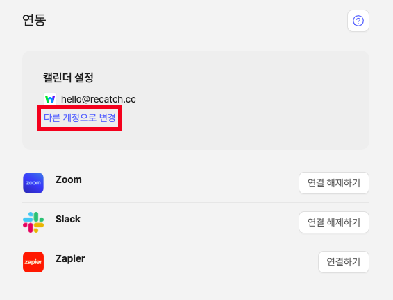 설정 > 연동페이지로 이동 후다른 계정으로 변경링크를 클릭합니다.네이버웍스 캘린더 항목의 연동 버튼을 클릭합니다.