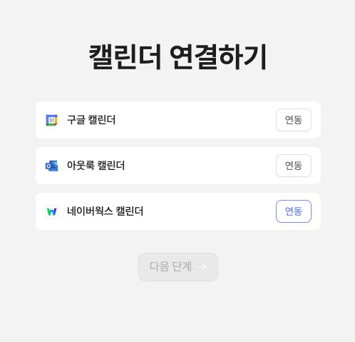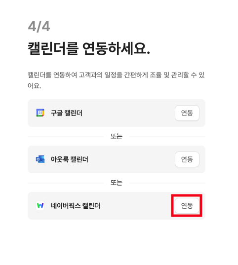 리캐치 회원가입 절차 중 캘린더 연동 절차에서 네이버웍스 캘린더 항목의 연동 버튼을 클릭합니다.