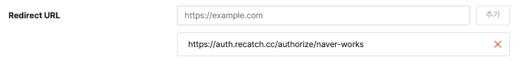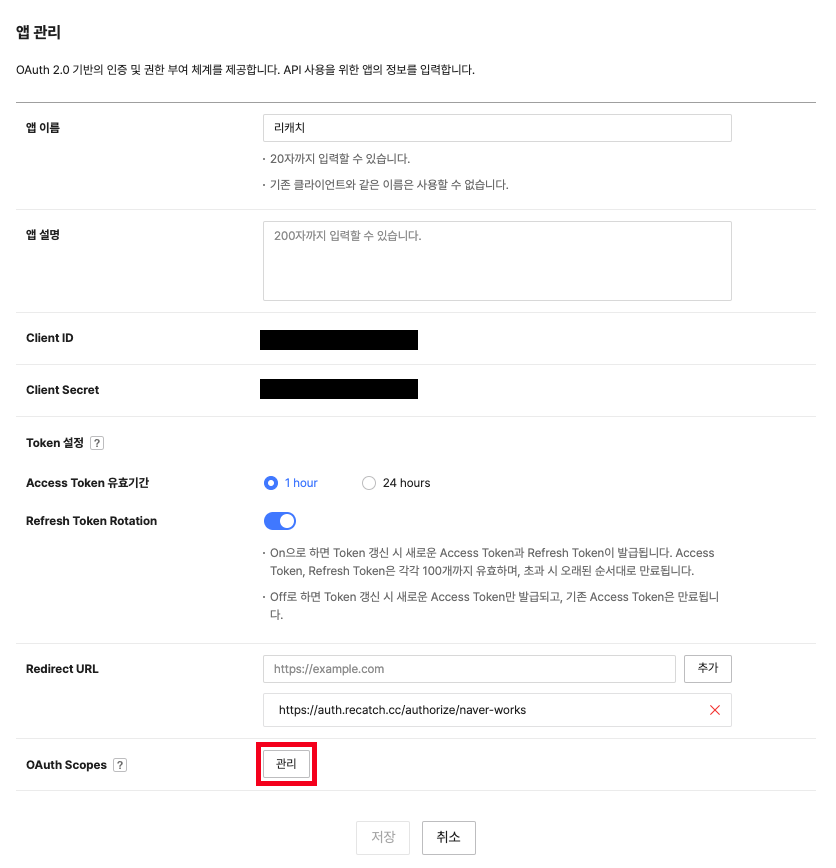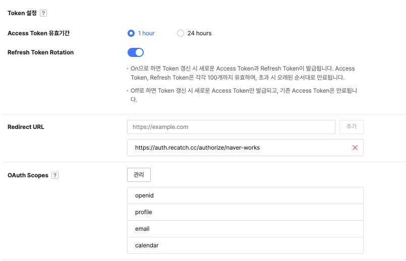 https://auth.recatch.cc/authorize/naver-works를 추가합니다.OAuth Scopes 영역의 관리 버튼을 클립합니다.
