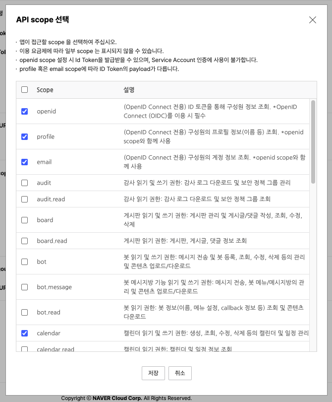 openid,profile,email,calendar를 선택한 후 저장 버튼을 클릭합니다.다음과 같이 설정이 되었다면 하단의 저장 버튼을 클릭해 앱 추가를 마무리합니다.