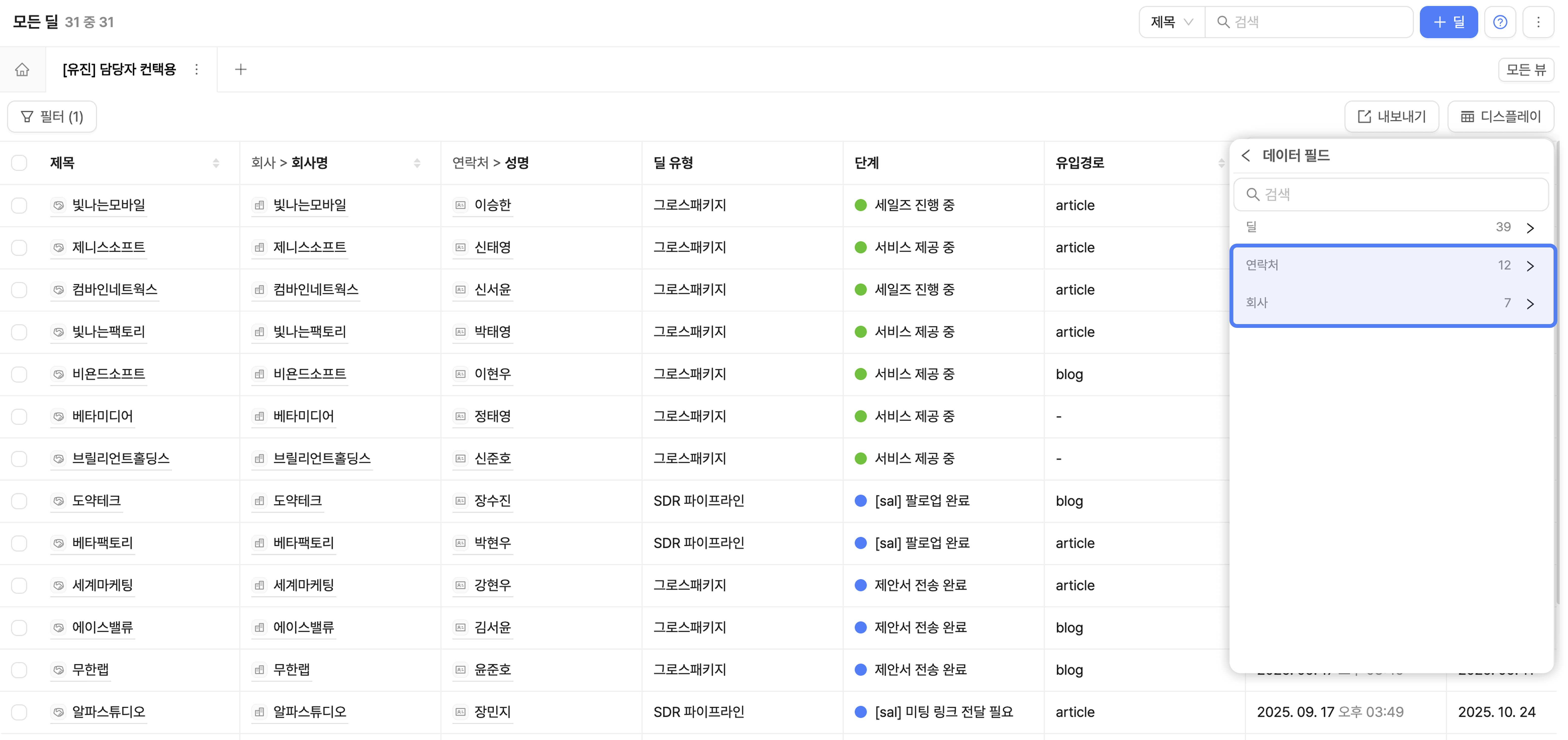 '연락처'와 '회사' 개체에 연결된 정보들 또한 테이블에서 확인할 수 있습니다.