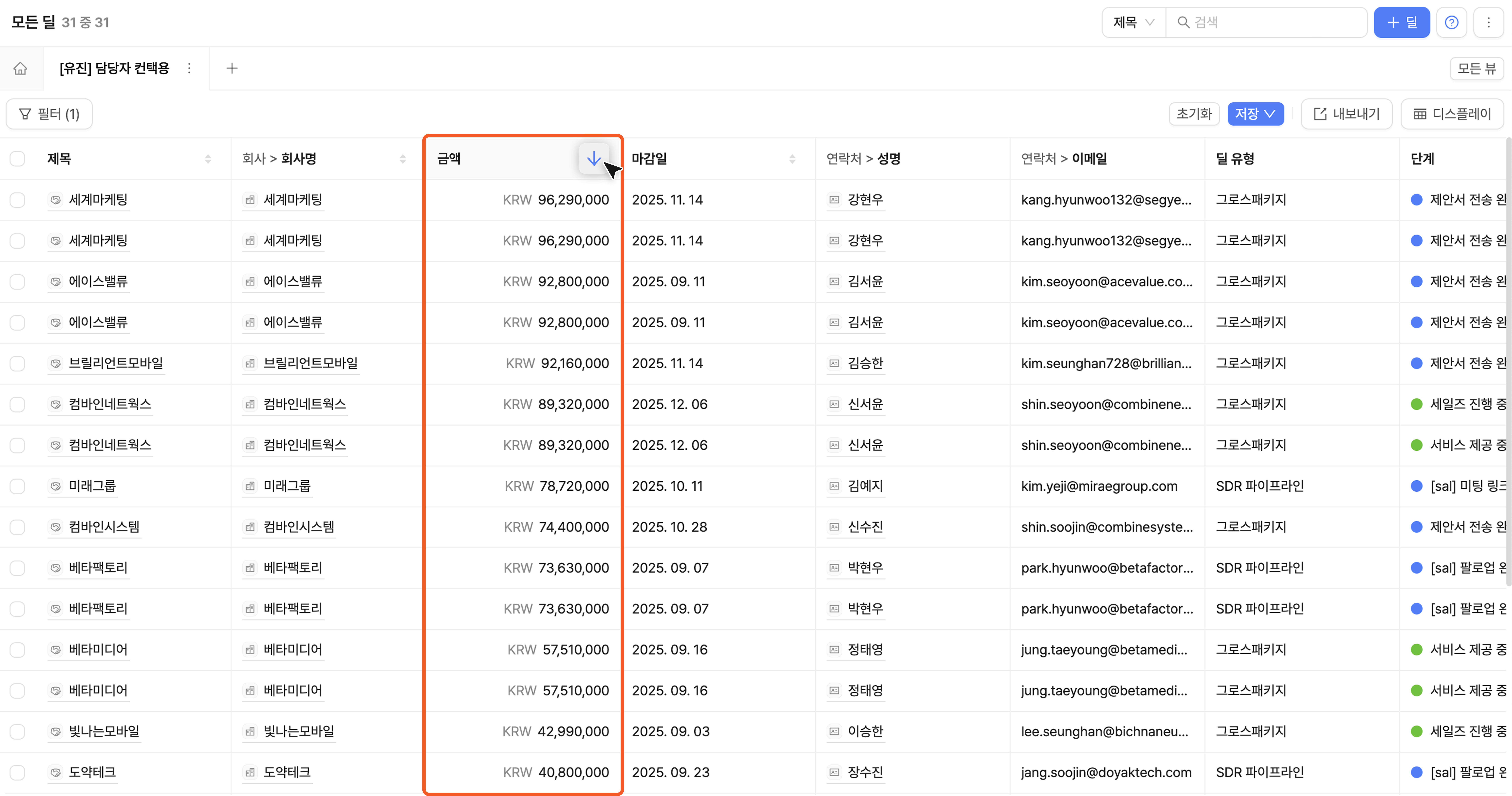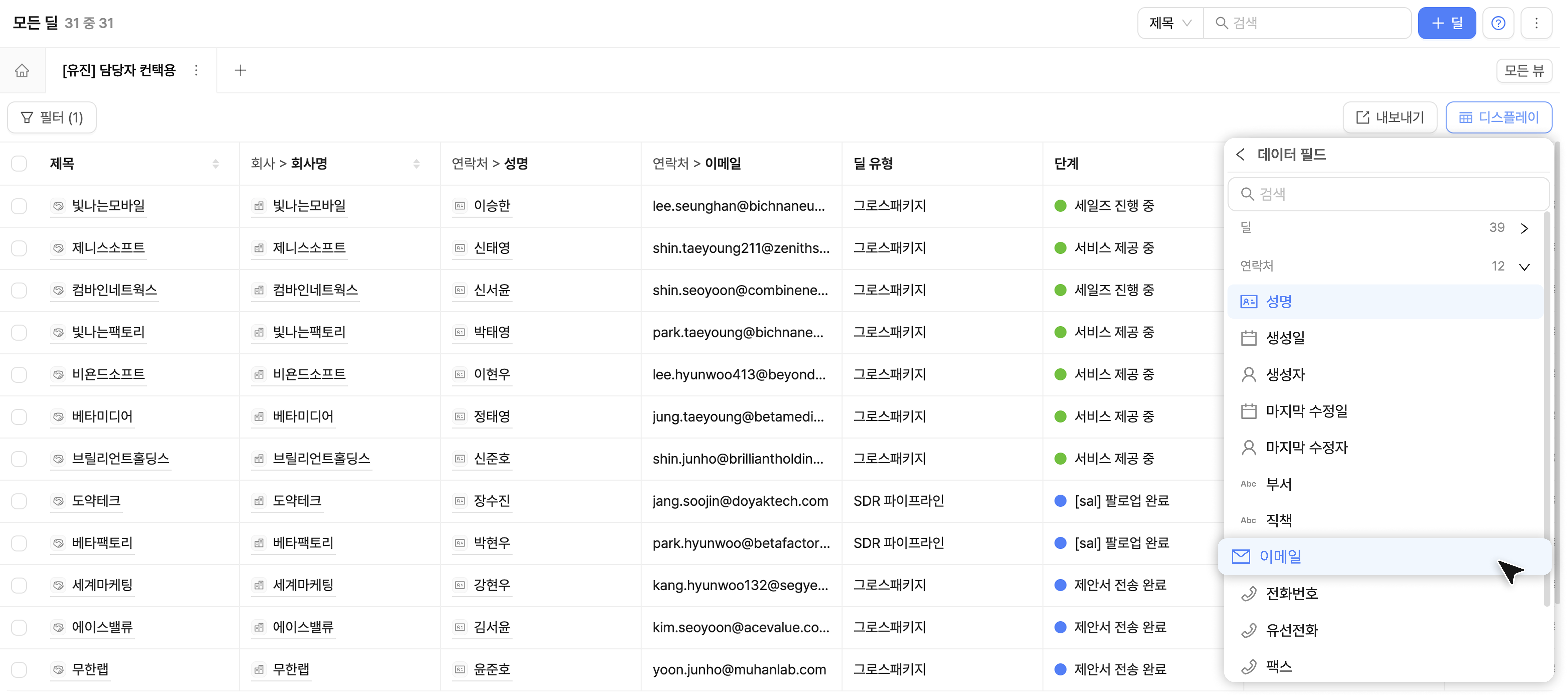 아래와 같이, 연락처에 연결된 '이메일' 필드를 칼럼으로 표시되도록 설정이 가능합니다.