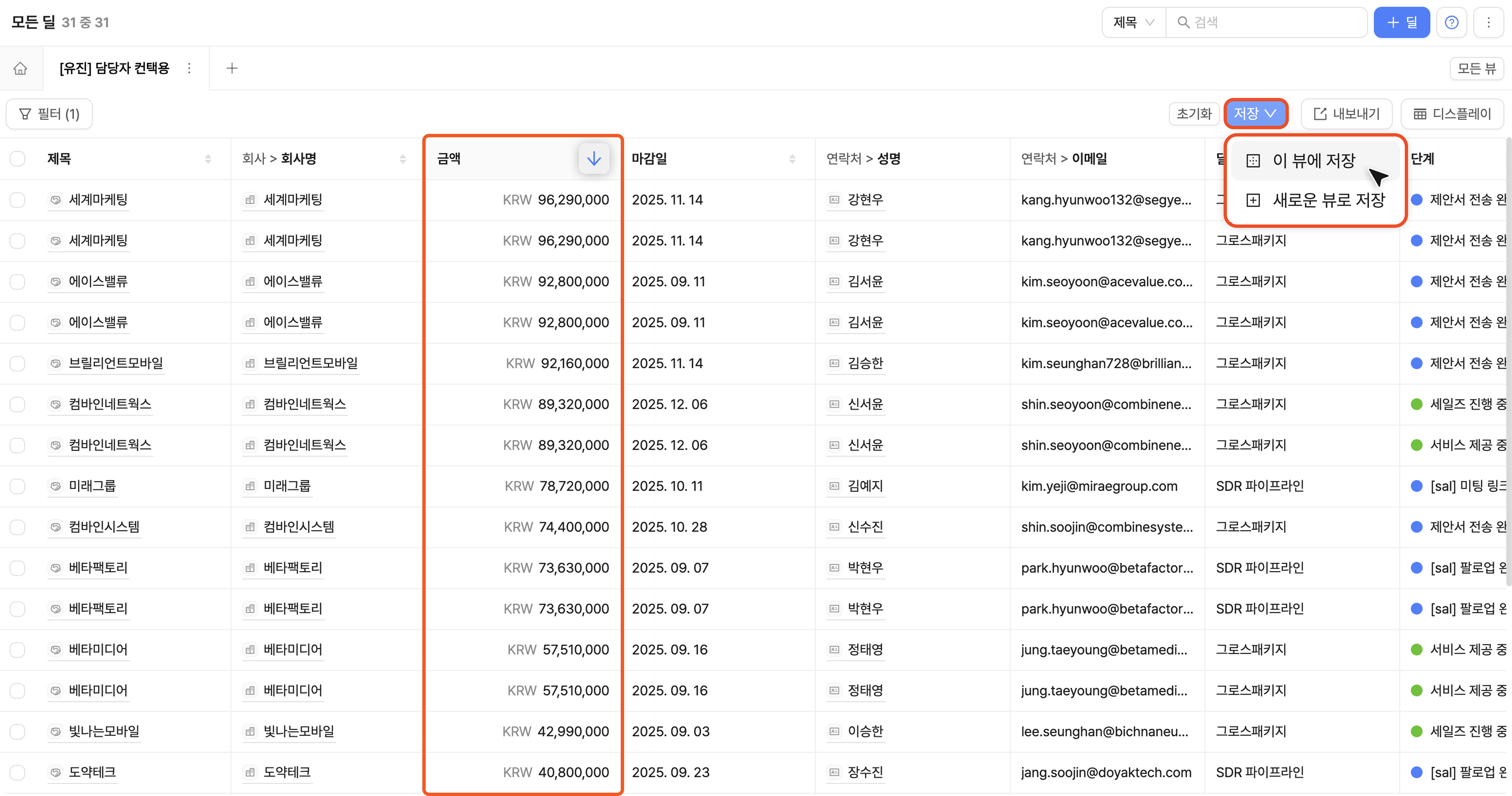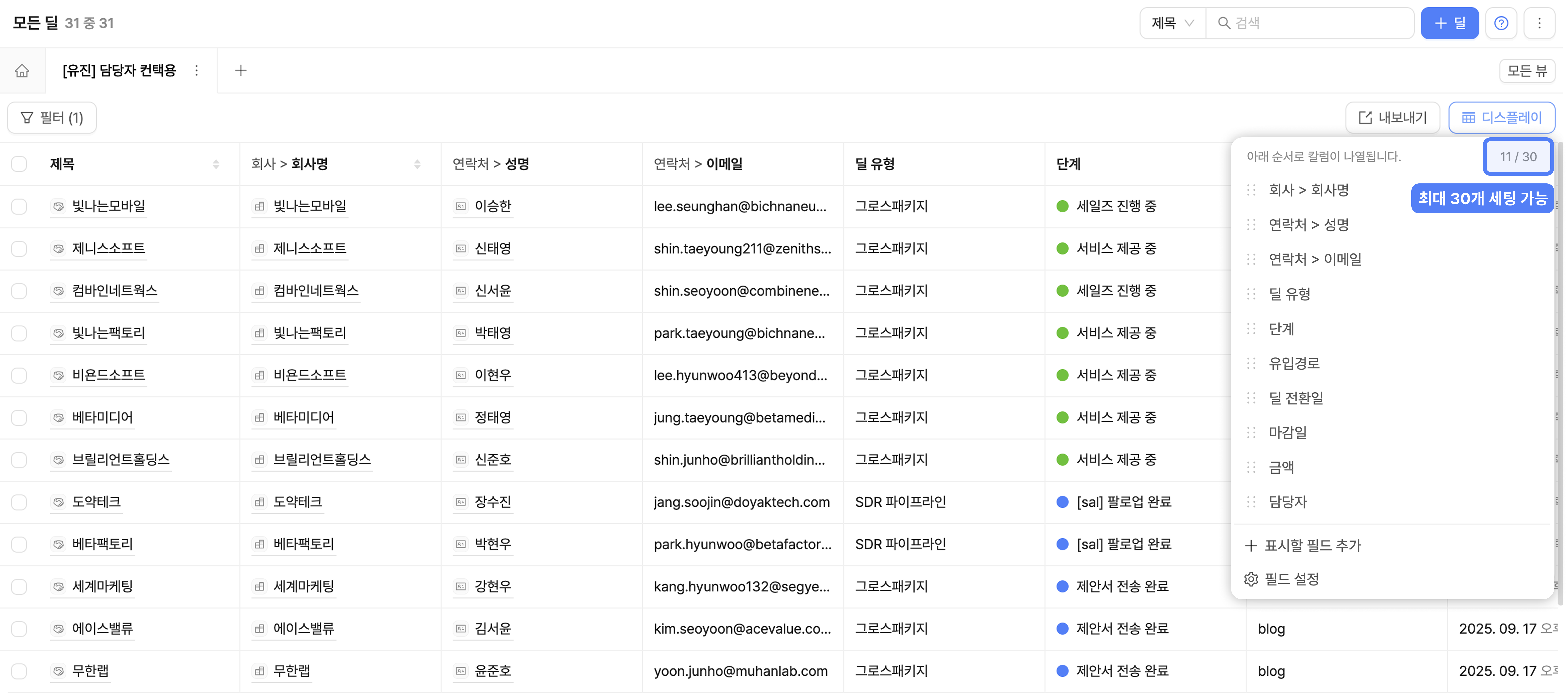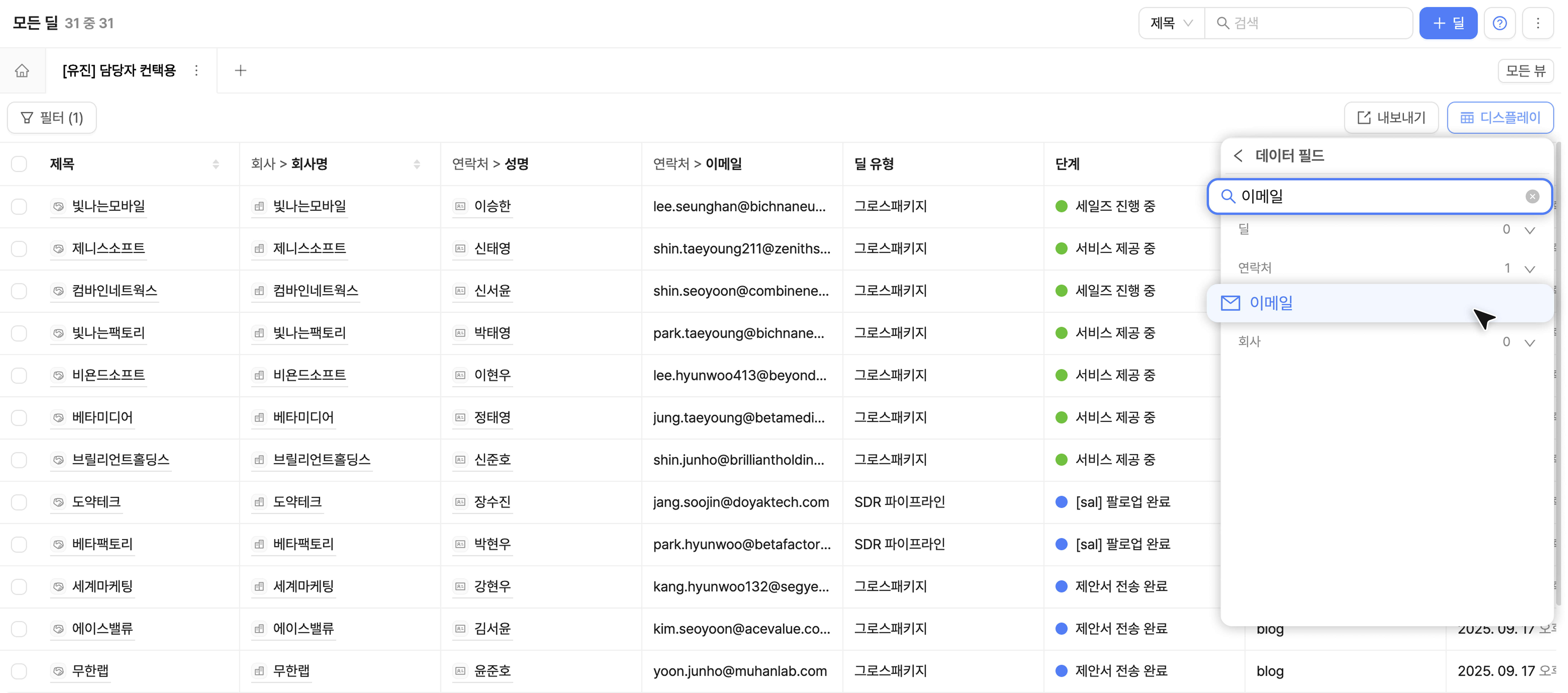 예를 들면, 아래와 같이 연락처 내 '이메일' 필드를 칼럼으로 표시할 수 있어요.