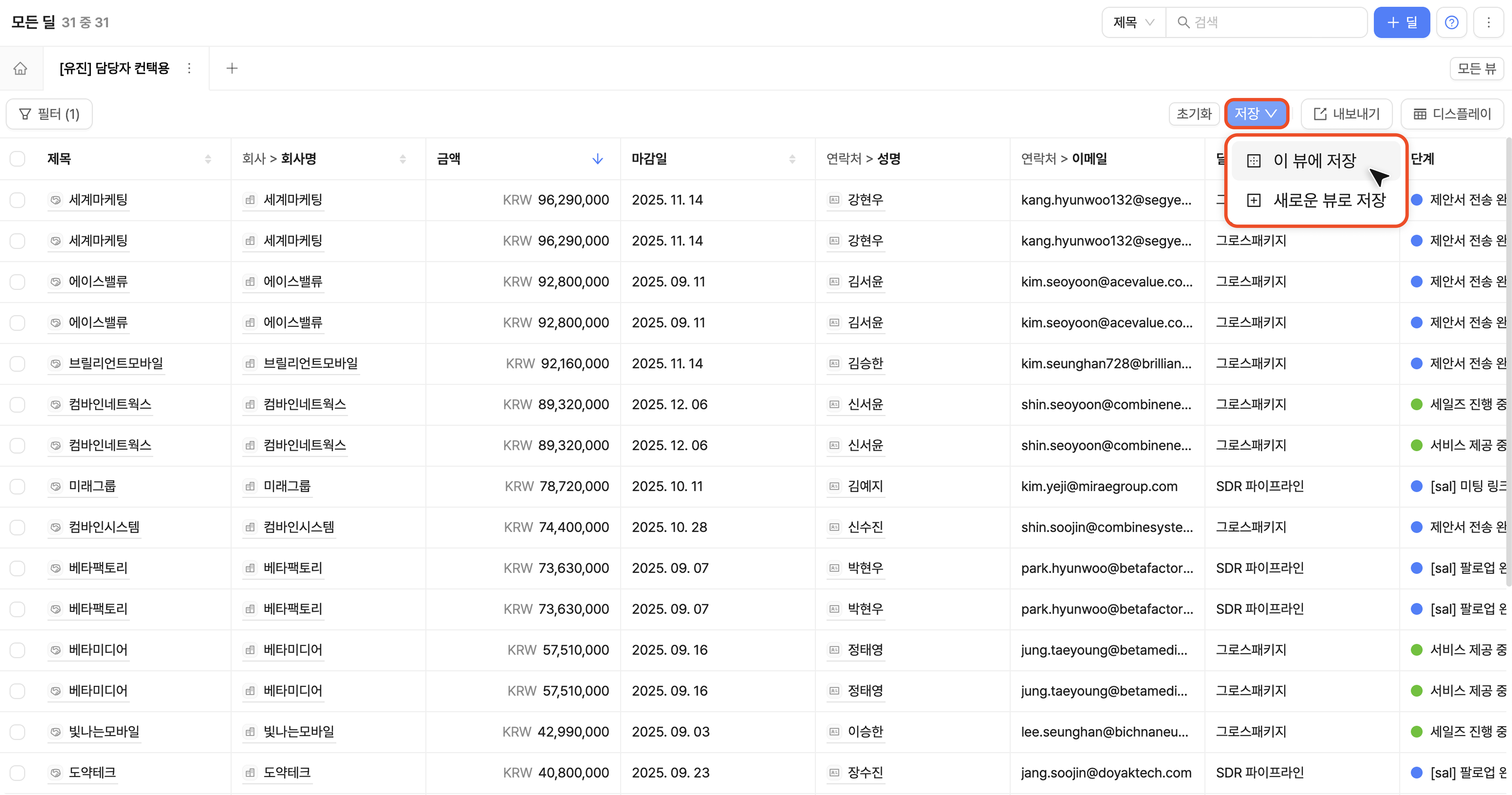 '이 뷰에 저장'을 클릭하면 현재 보고 있는 뷰에 해당 정렬이 저장됩니다.
