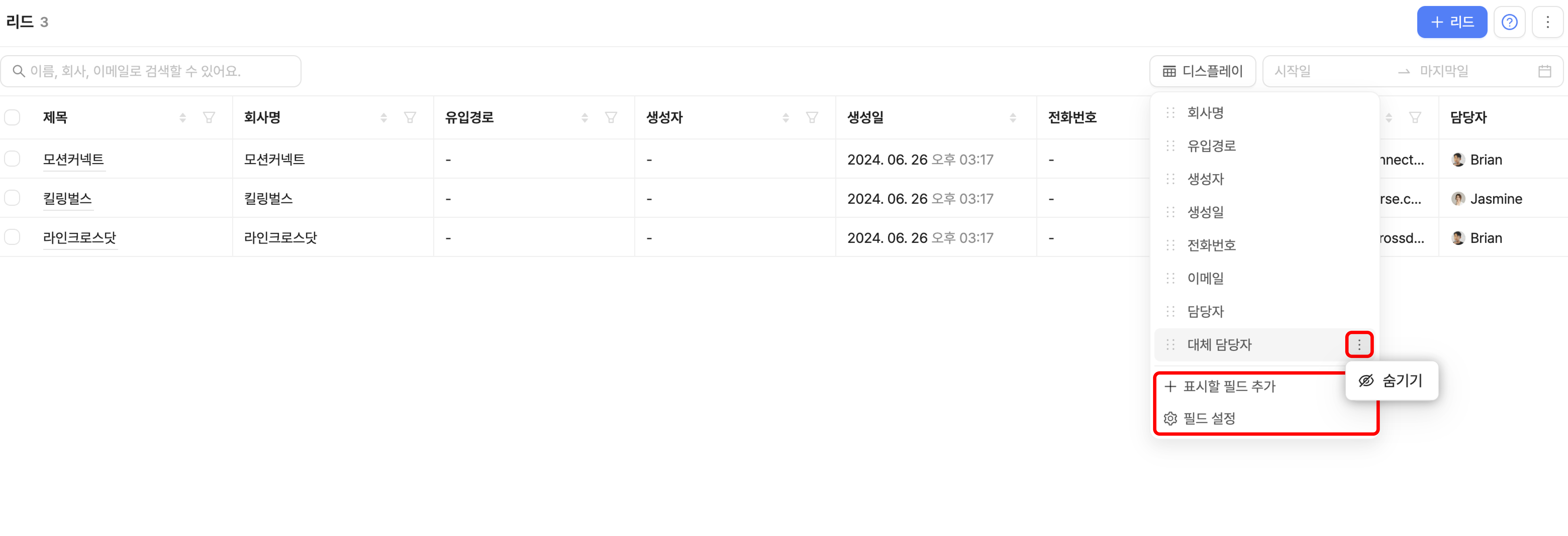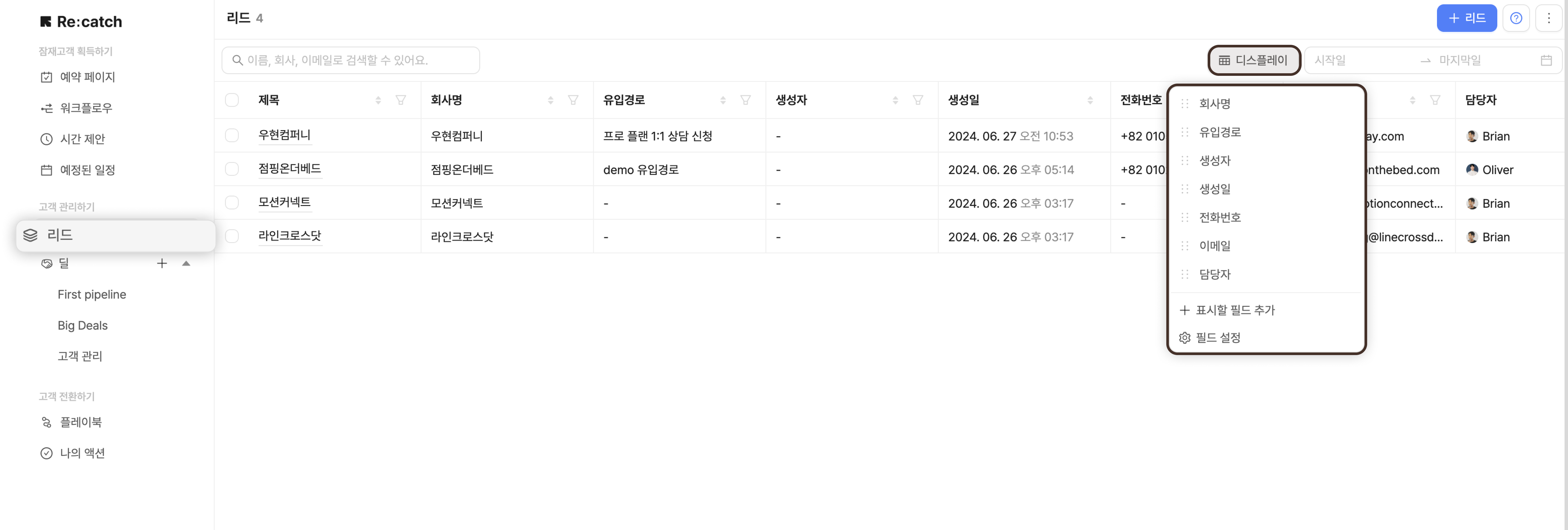 우측 상단의 '디스플레이'를 클릭하여 리드 테이블에서 확인하고 싶은 항목을 필터링할 수 있어요.