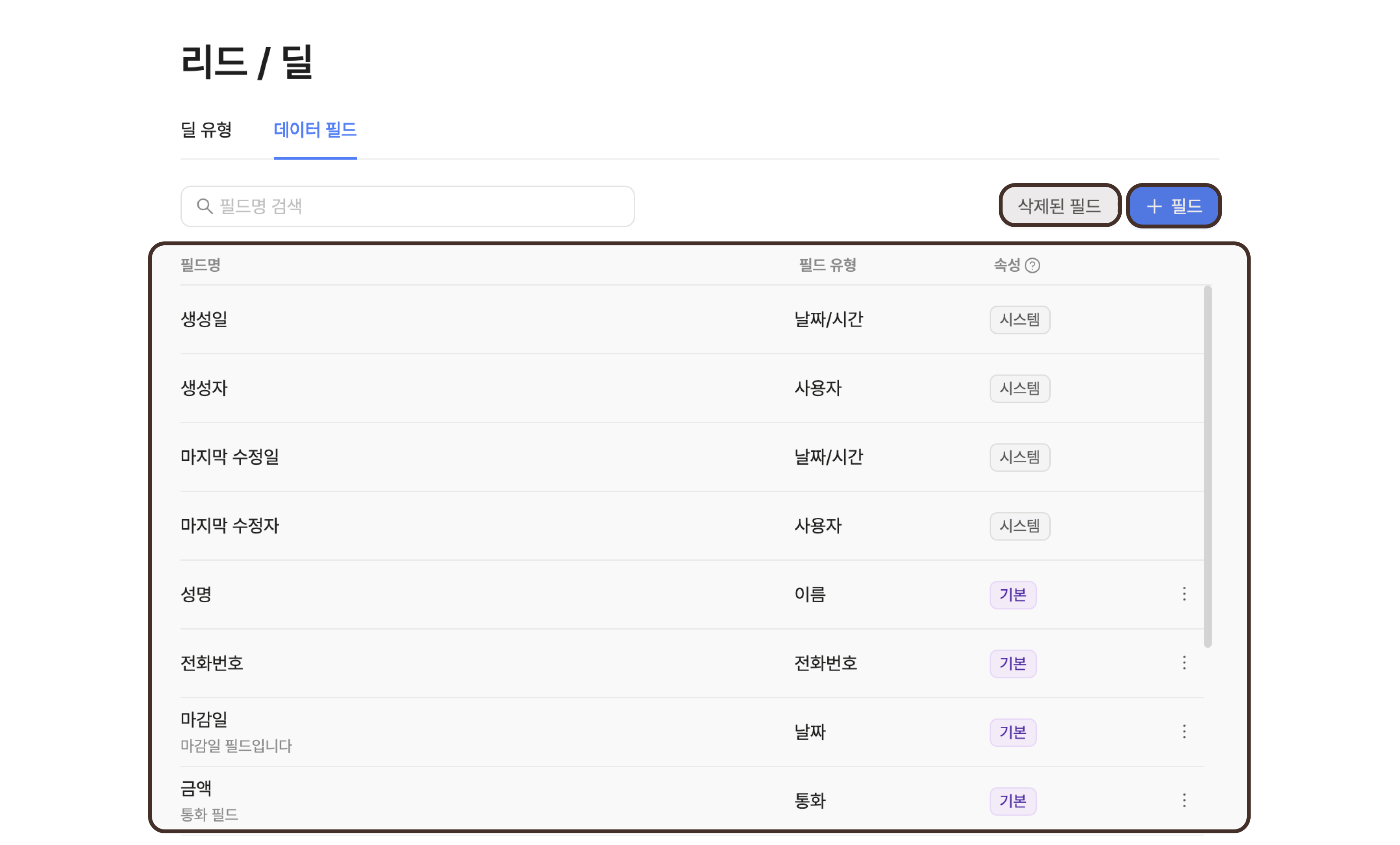 필드 설정을 클릭하면 리드/딜 데이터필드로 이동합니다.