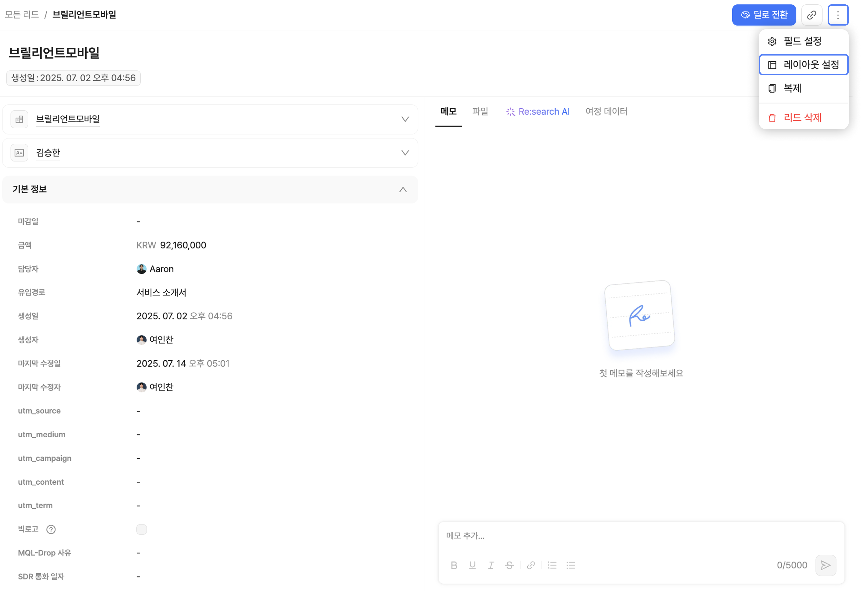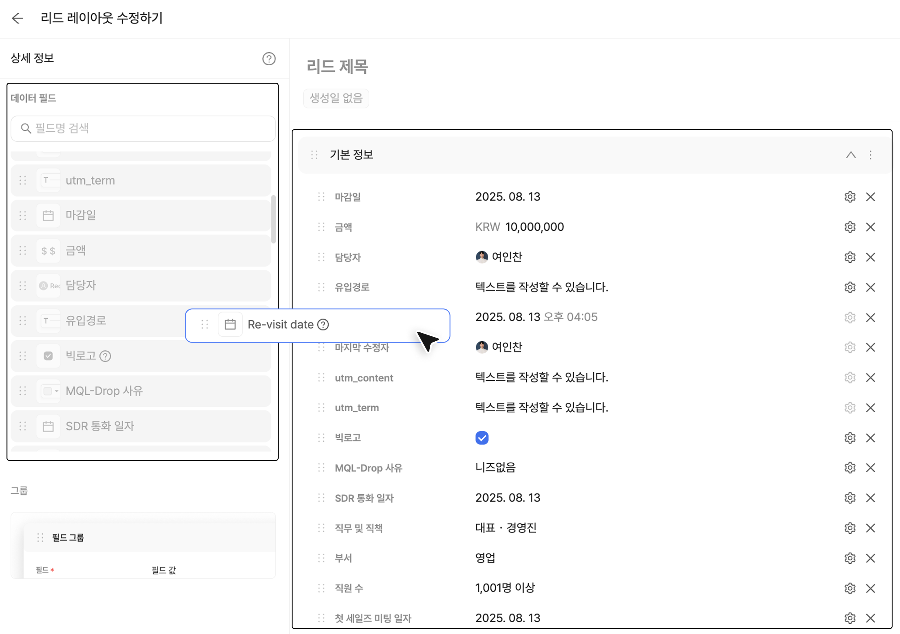 리드나 딜의 상세 정보 레이아웃을 설정할 수 있습니다.