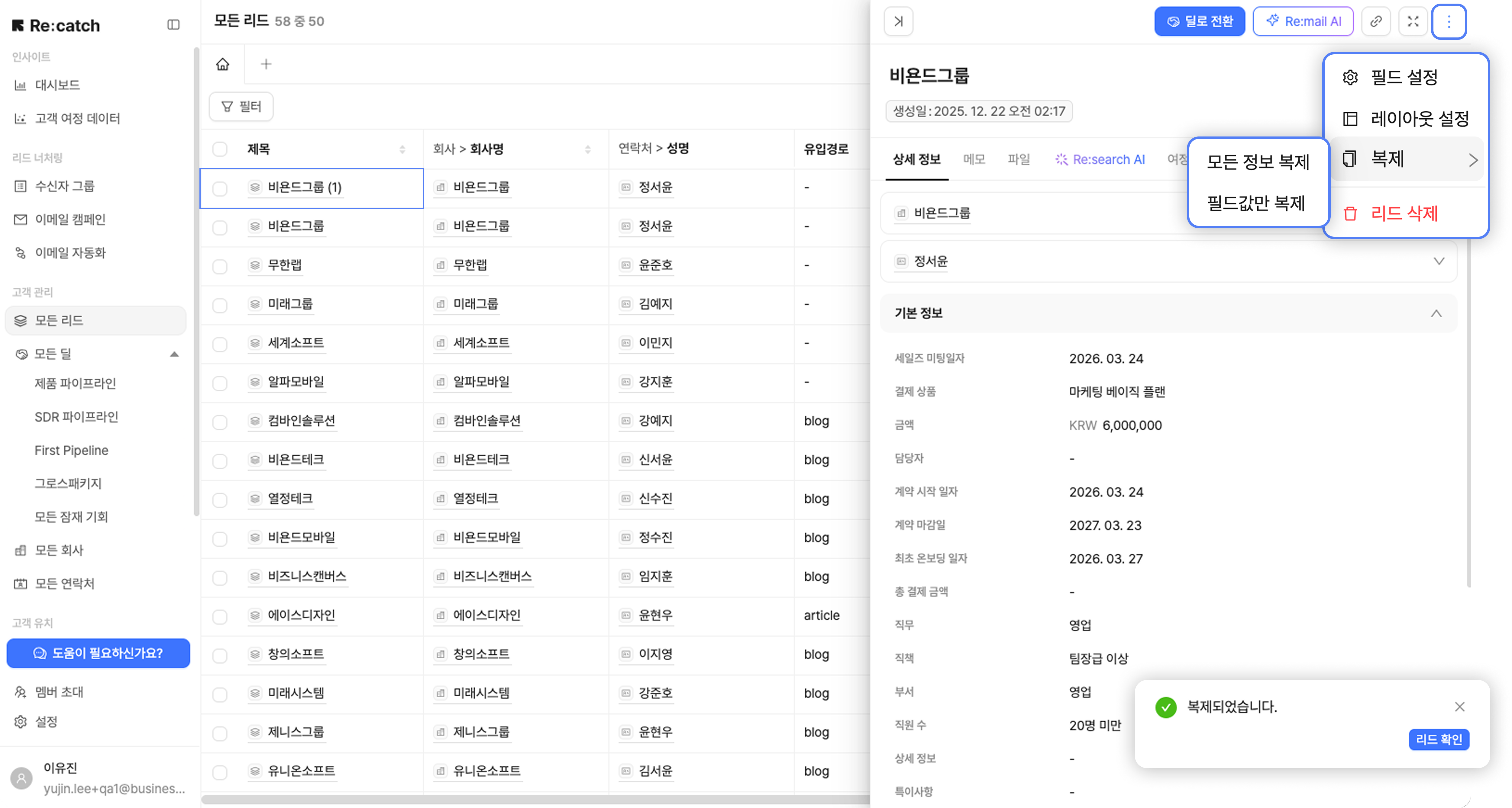예시: '비욘드그룹' 리드 복제 시 → '비욘드그룹 (1)' 리드 생성