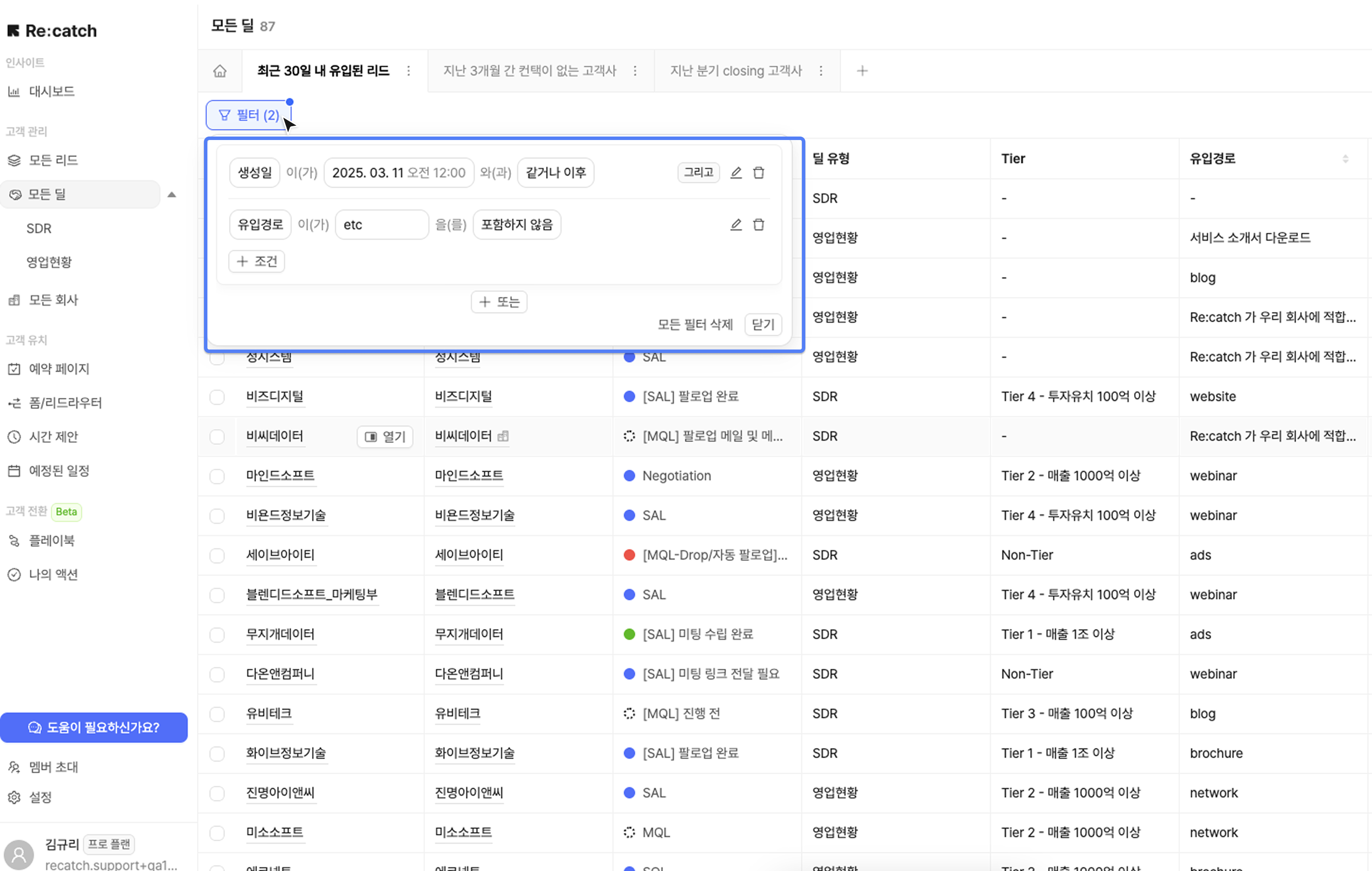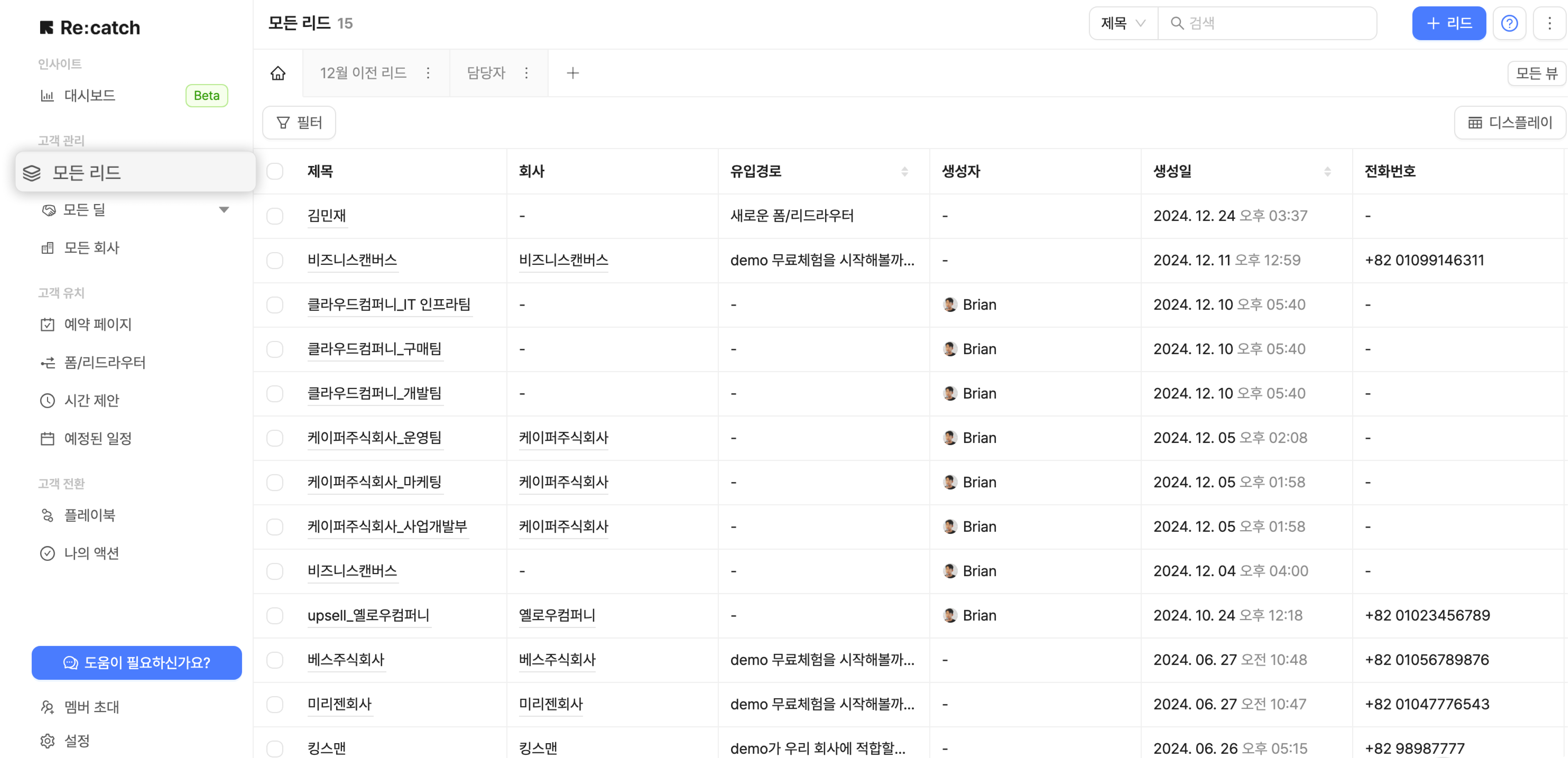 잠재 고객의 정보를 확인하고, 마지막 액션이 언제, 무엇이었는지, 회사명과 유입 경로 등 필요한 정보를 리스트 형식으로 확인할 수 있어요.