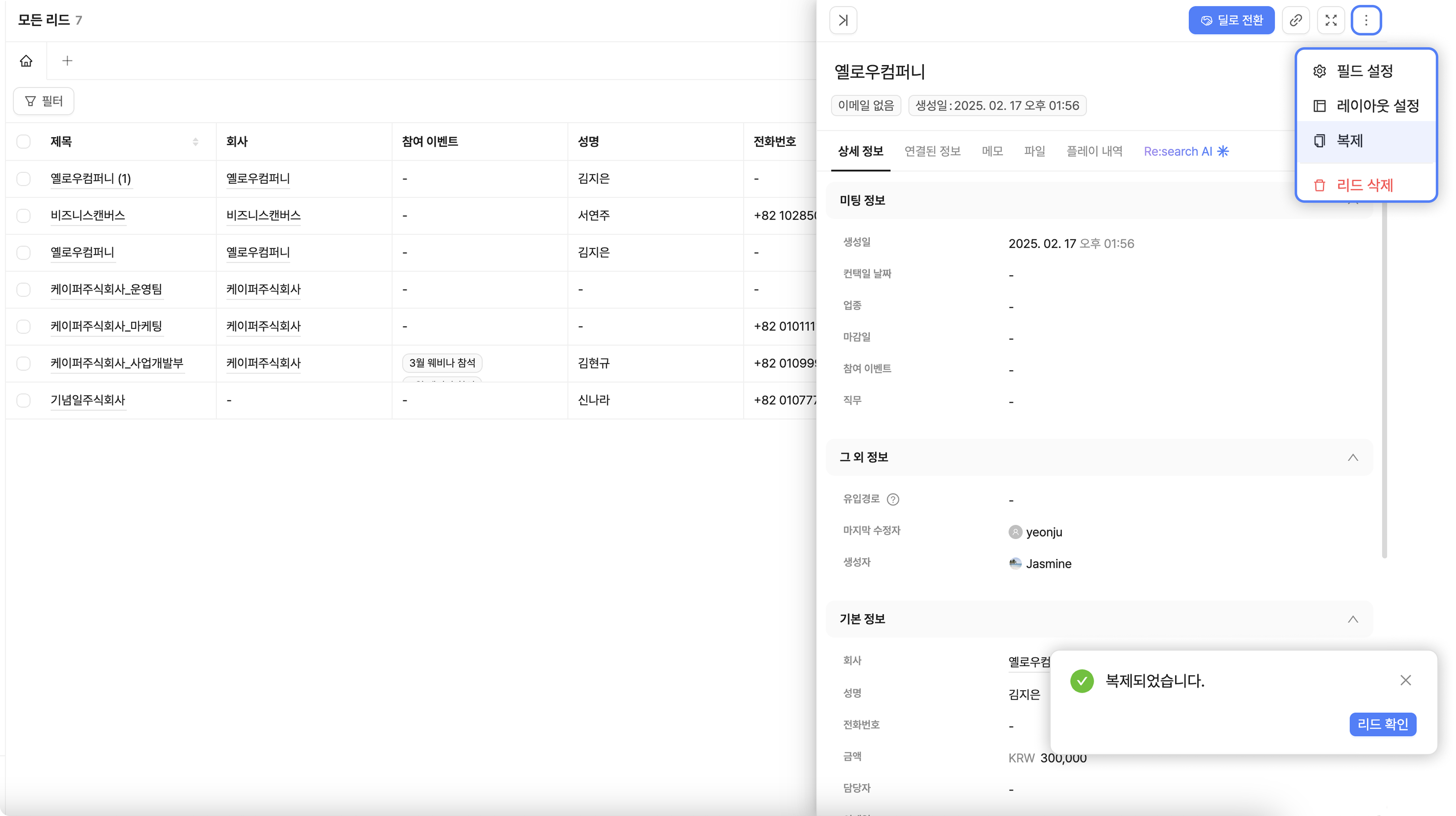 예시 : '옐로우컴퍼니' 리드를 복제한 경우 '옐로우컴퍼니 (1)'이라는 복제된 리드가 생성됩니다.