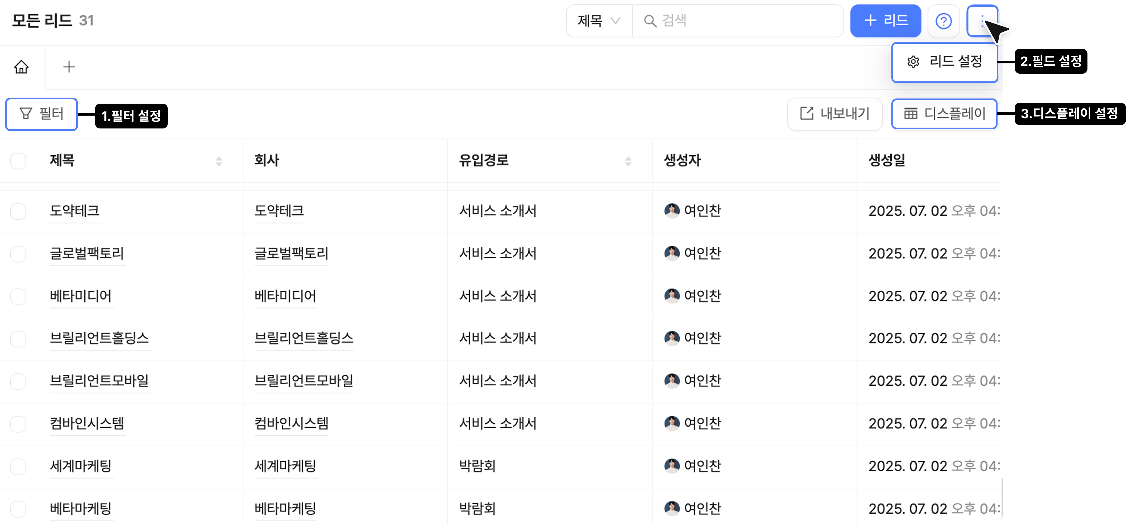 도움말: 리드를 대량으로 추가하기를 원하시는 경우 대량 업로드 가이드를 확인해주세요!