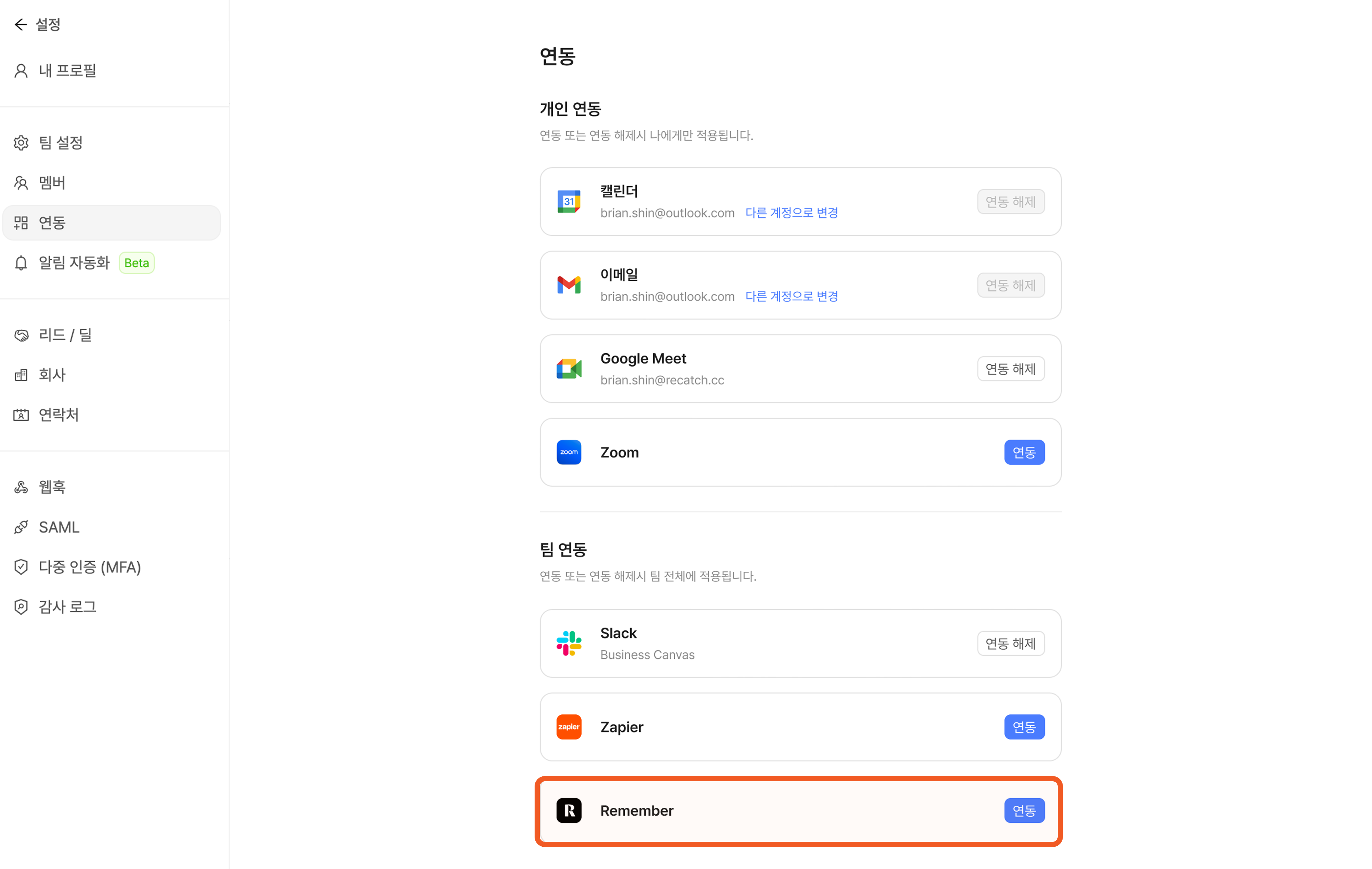 도움말 : 팀의 어드민만 리멤버 연동 및 해제가 가능합니다.