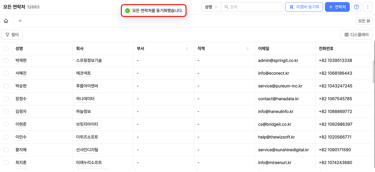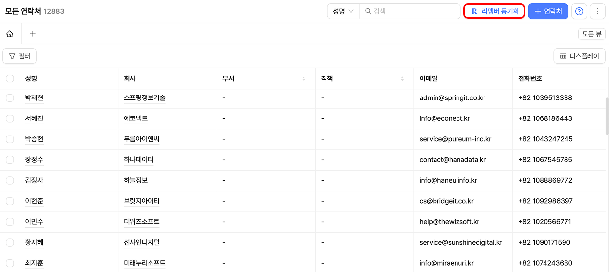 연동까지는 최대 48시간이 소요되며, 연동이 완료되면 연락처 페이지에서 '리멤버 동기화' 버튼이 나타납니다.