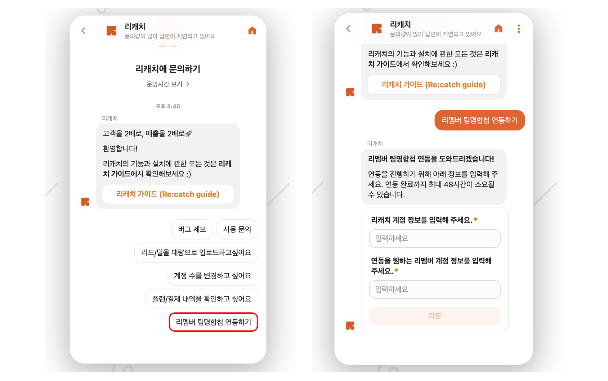 리멤버 팀 명함첩 연동하기' 버튼을 클릭 후, 리캐치의 계정 정보와, 연동을 원하는 리멤버 계정 정보를 입력해 주세요.팀 명함첩 연동까지는 최대 48시간이 소요될 수 있습니다.