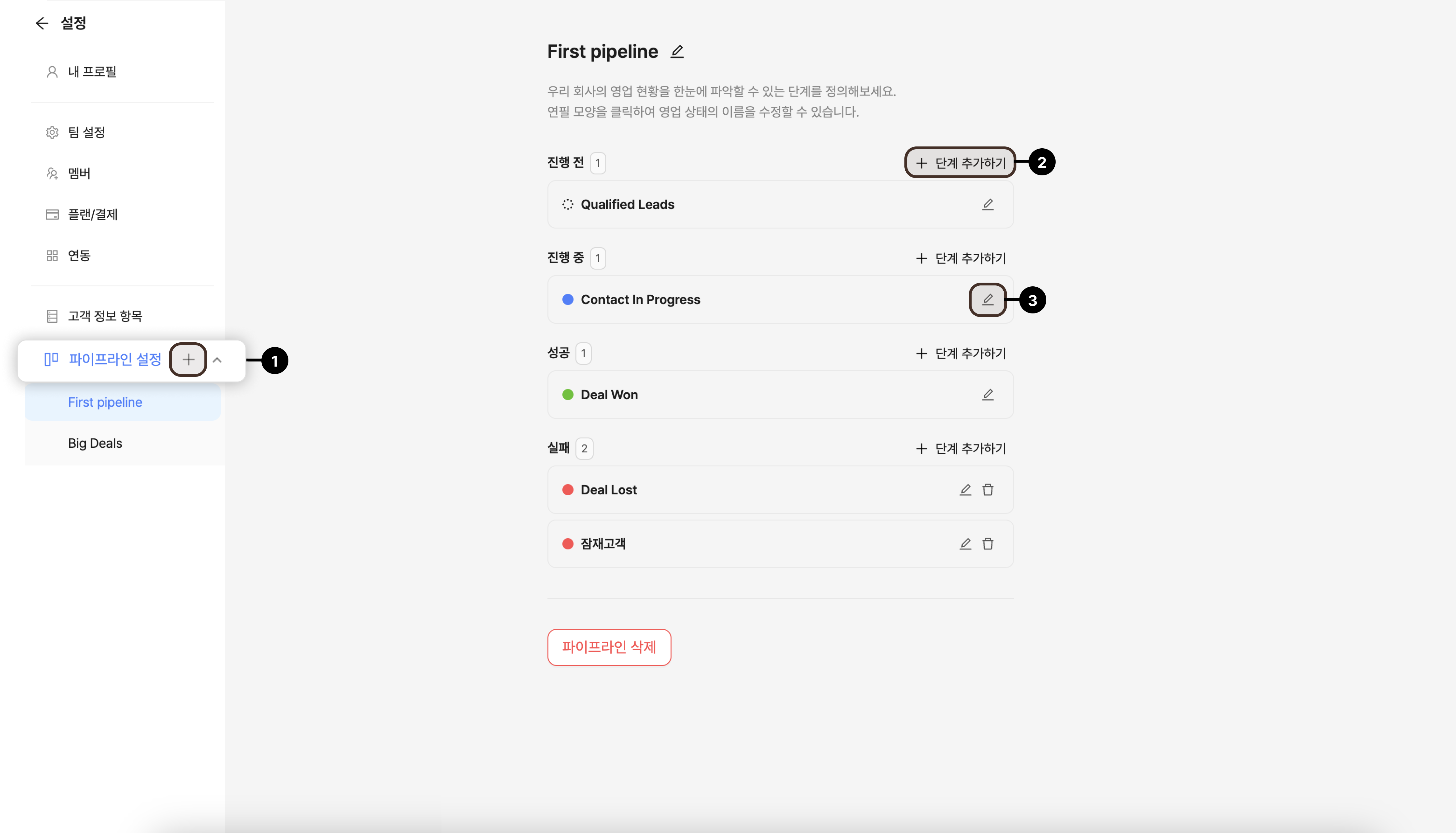 설정 - [파이프라인 설정]에서 수정할 수 있어요.