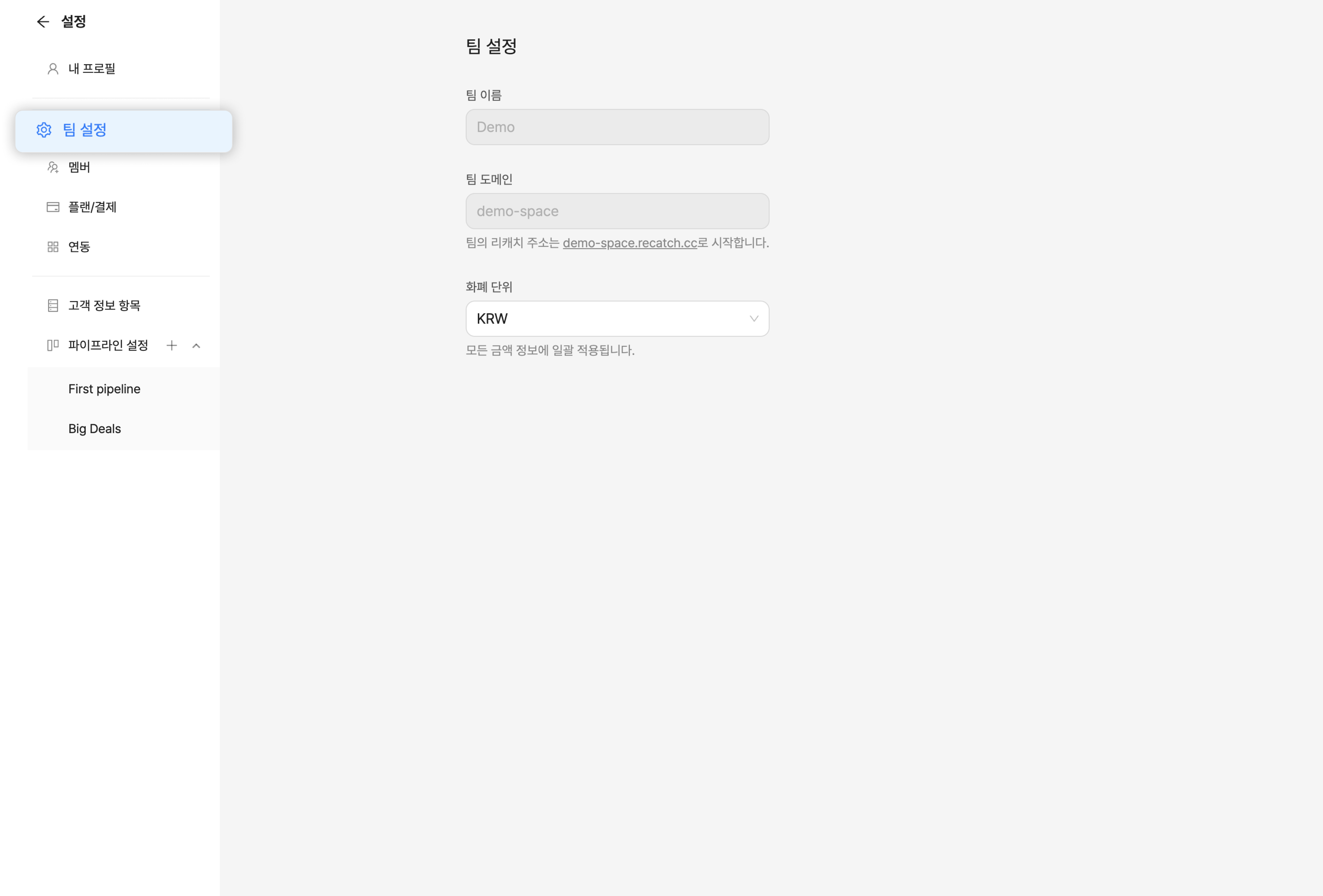 상단의 [멤버 초대]를 통해 리캐치를 함께 사용할 멤버를 초대할 수 있어요.