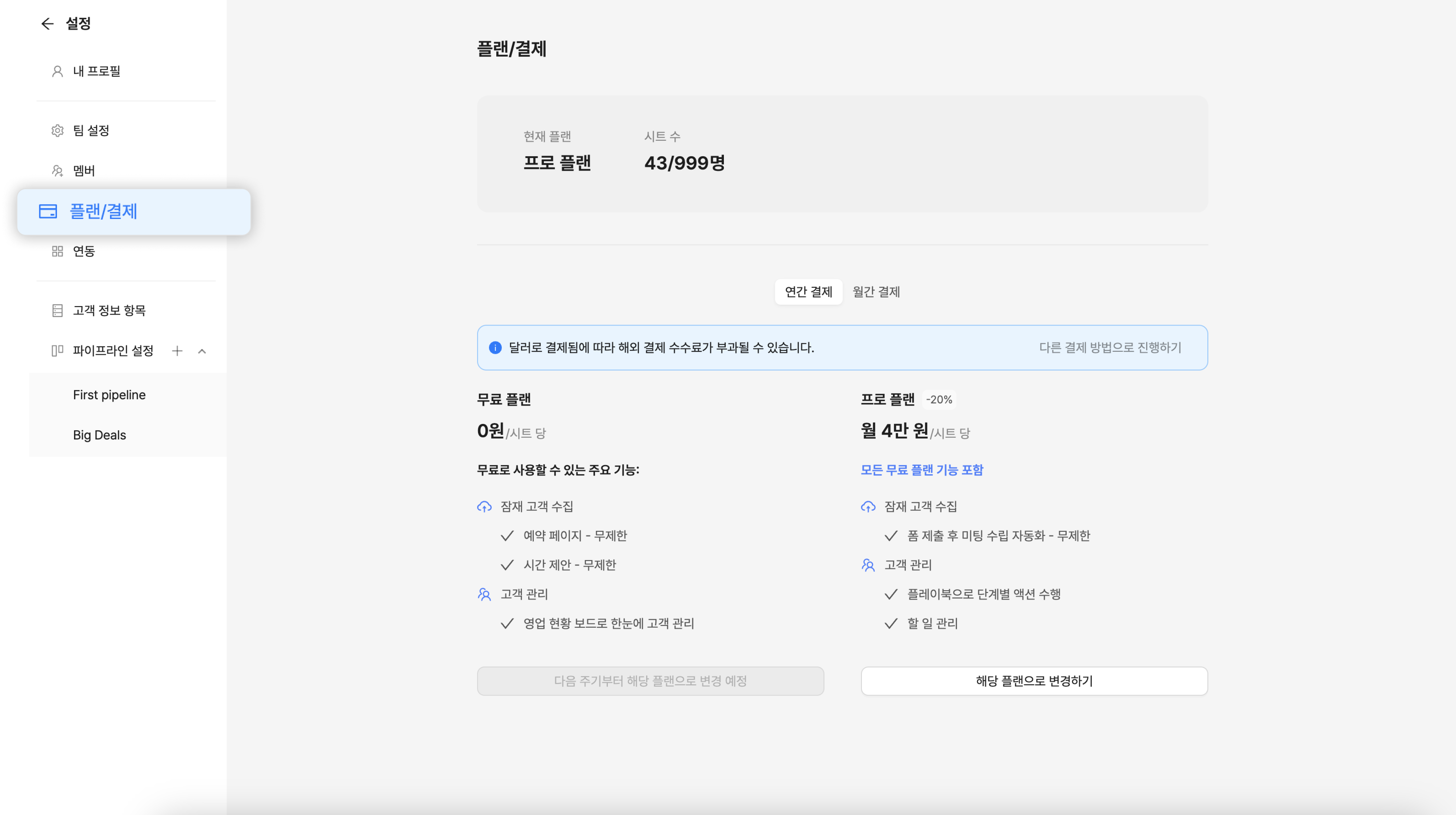 플랜/결제에서 사용하고 있는 플랜과 시트 수를 확인할 수 있어요.