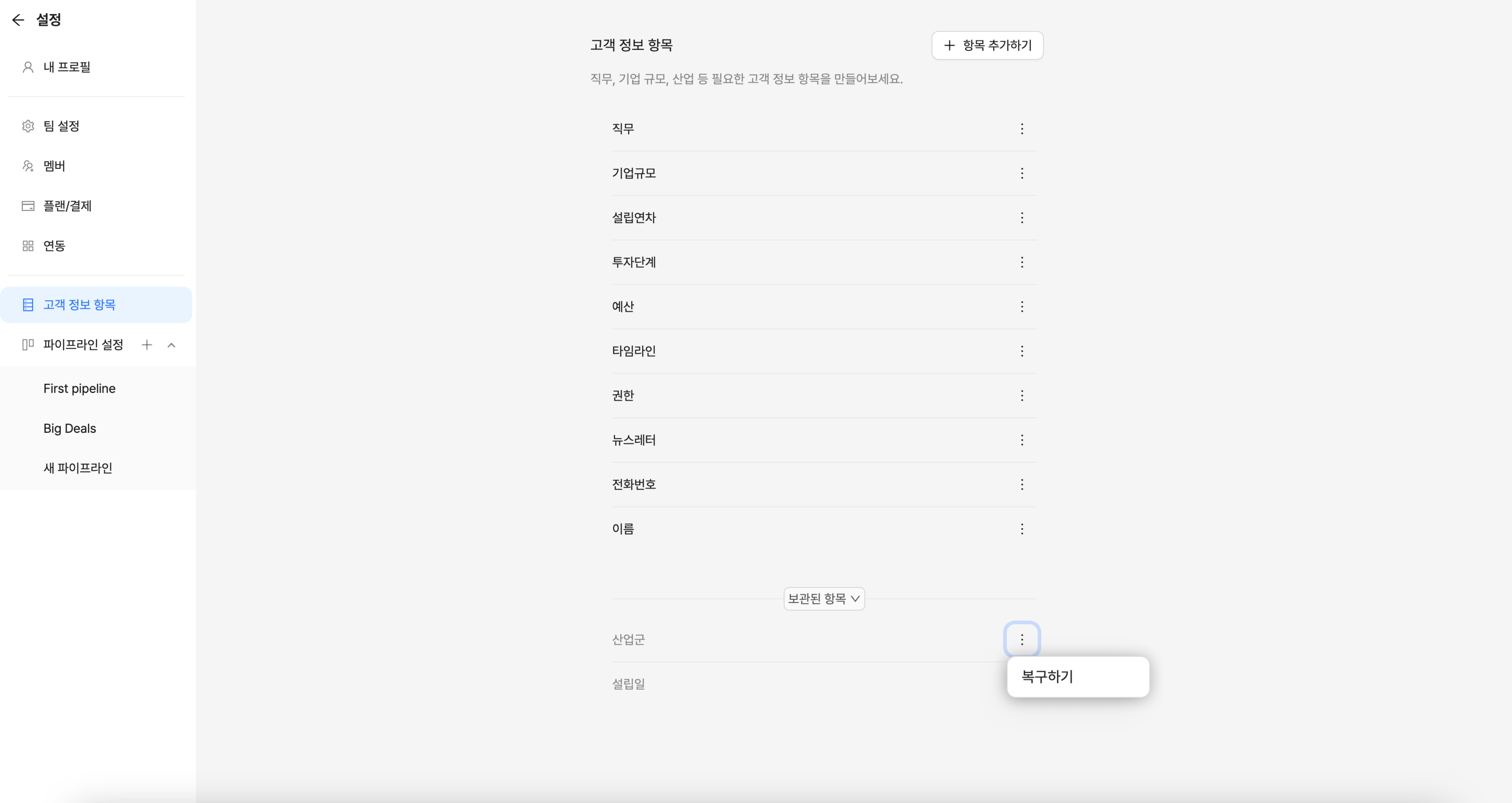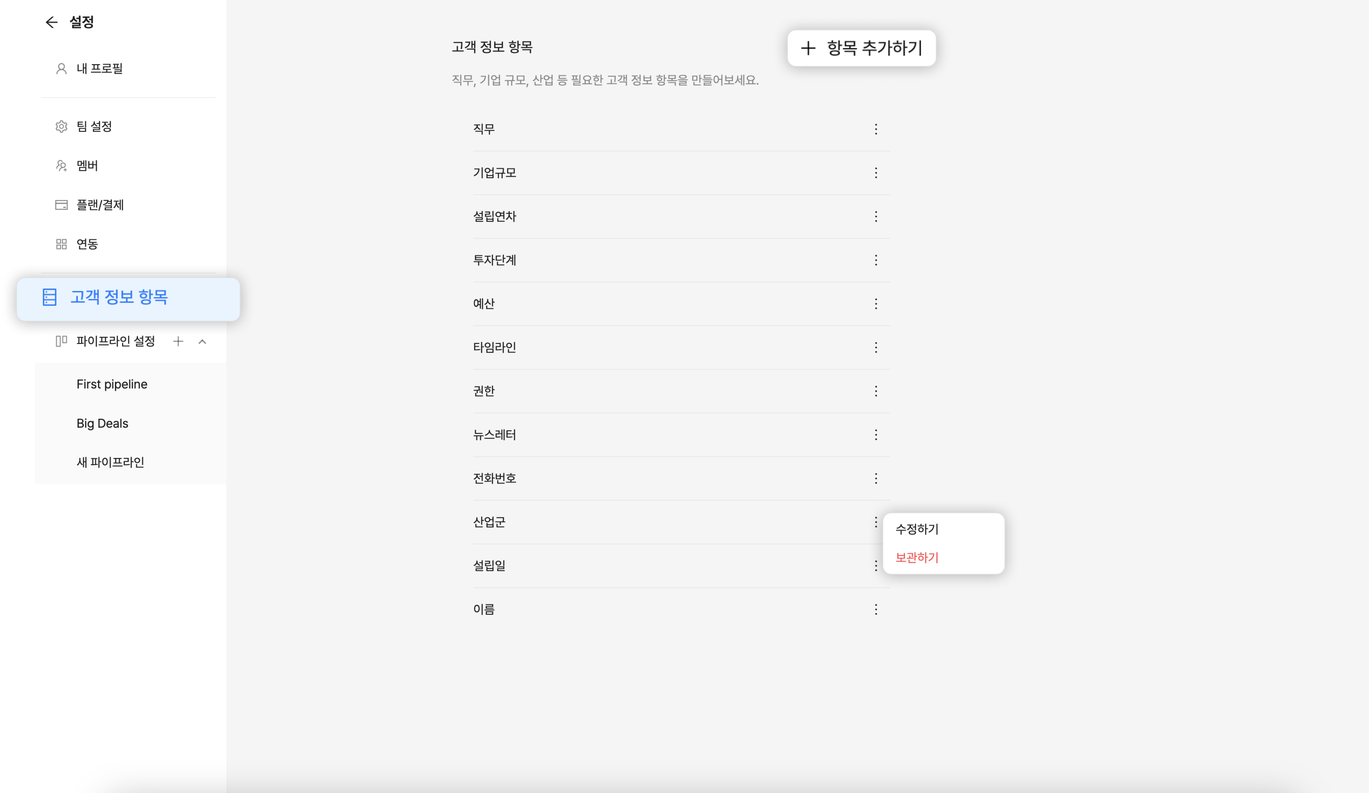 우측 상단의 '항목 추가하기'를 통해 필요한 항목을 작성해보세요. 더보기를 눌러 항목을 수정하거나 보관할 수 있습니다.
