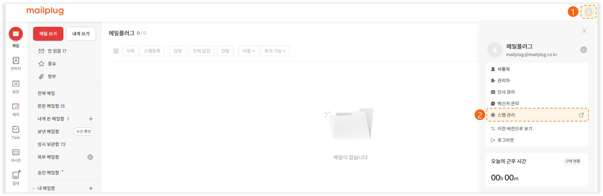 메일 플러그의 관리자 계정으로 진행해 주셔야 합니다.