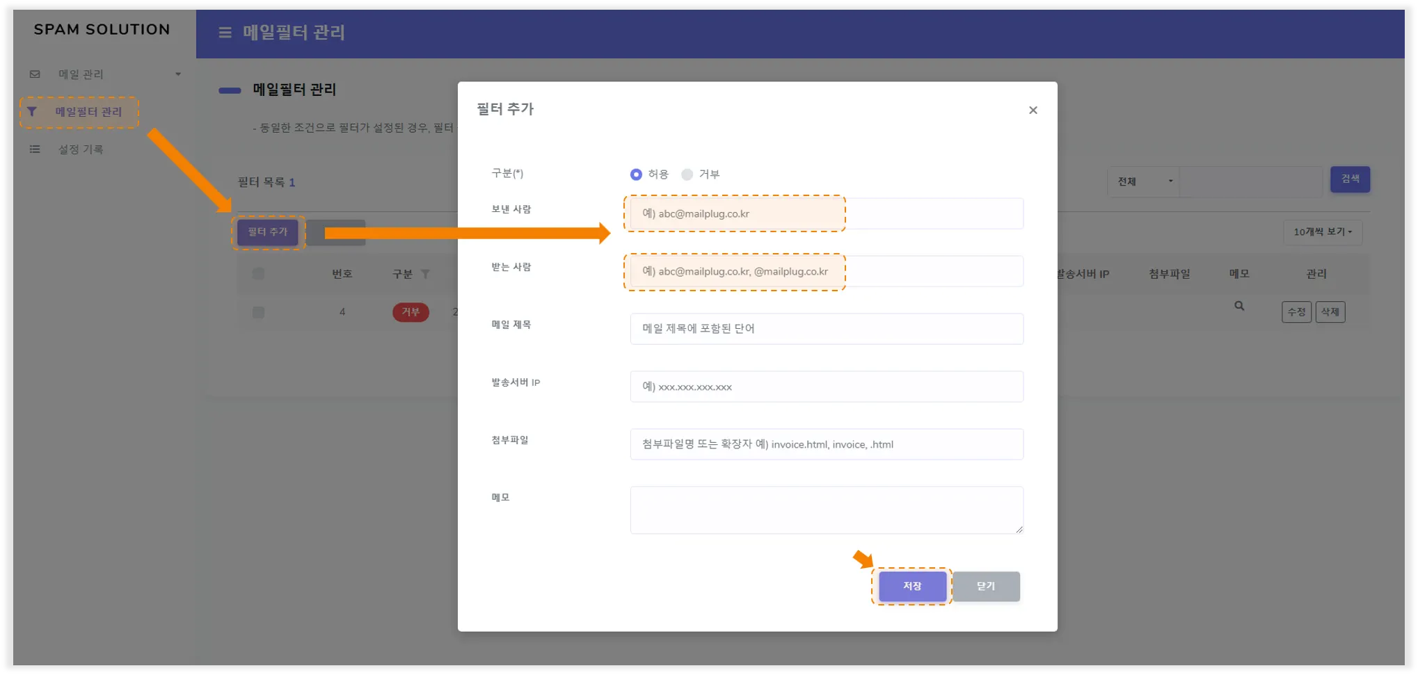 메일플러그 웹메일 관리자 계정 로그인 > 우측 상단 프로필 클릭 > 스팸 관리 > 메일필터 관리