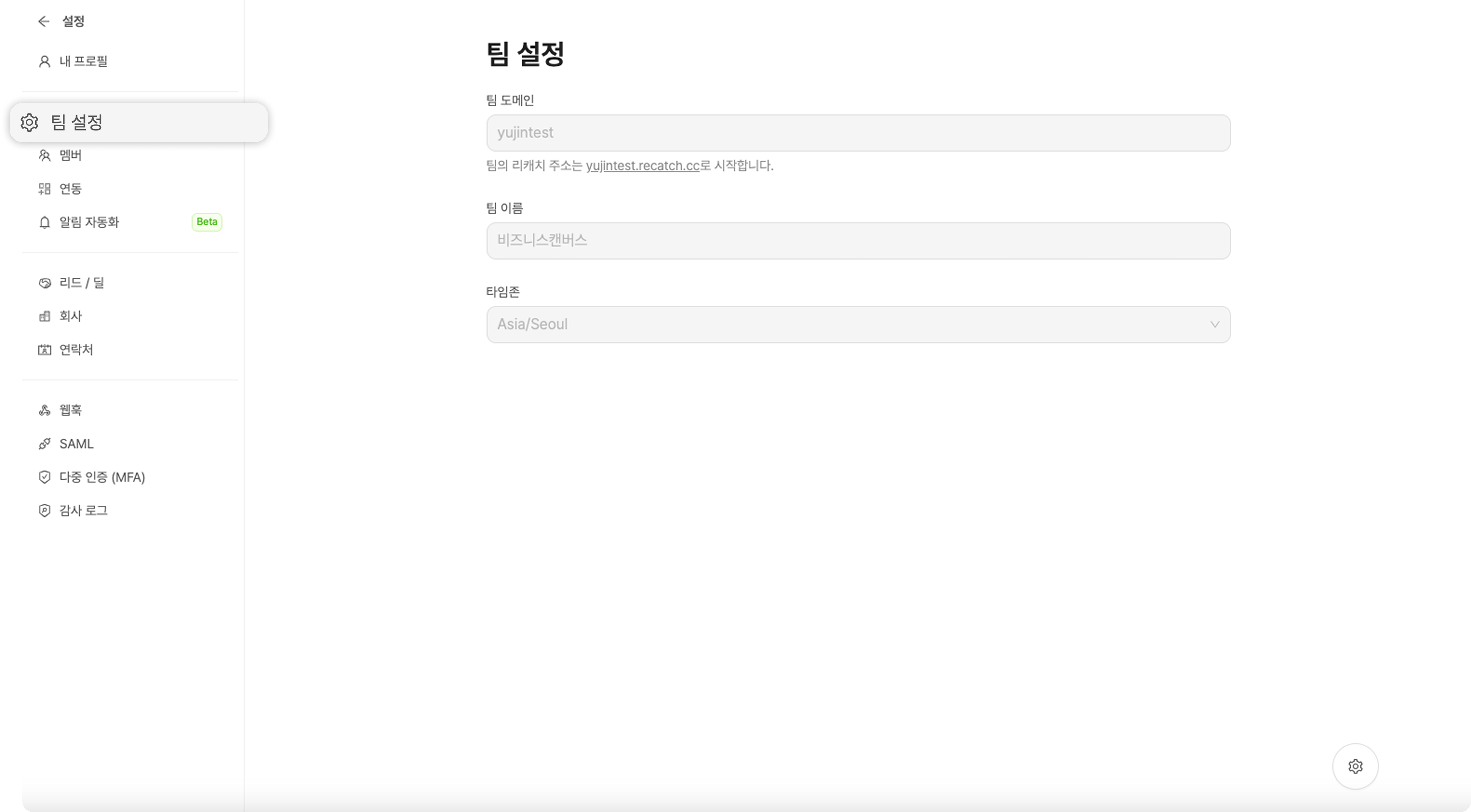 설정하신 회사명과 회사 도메인은 '설정' - '팀 설정'에서 확인할 수 있어요.