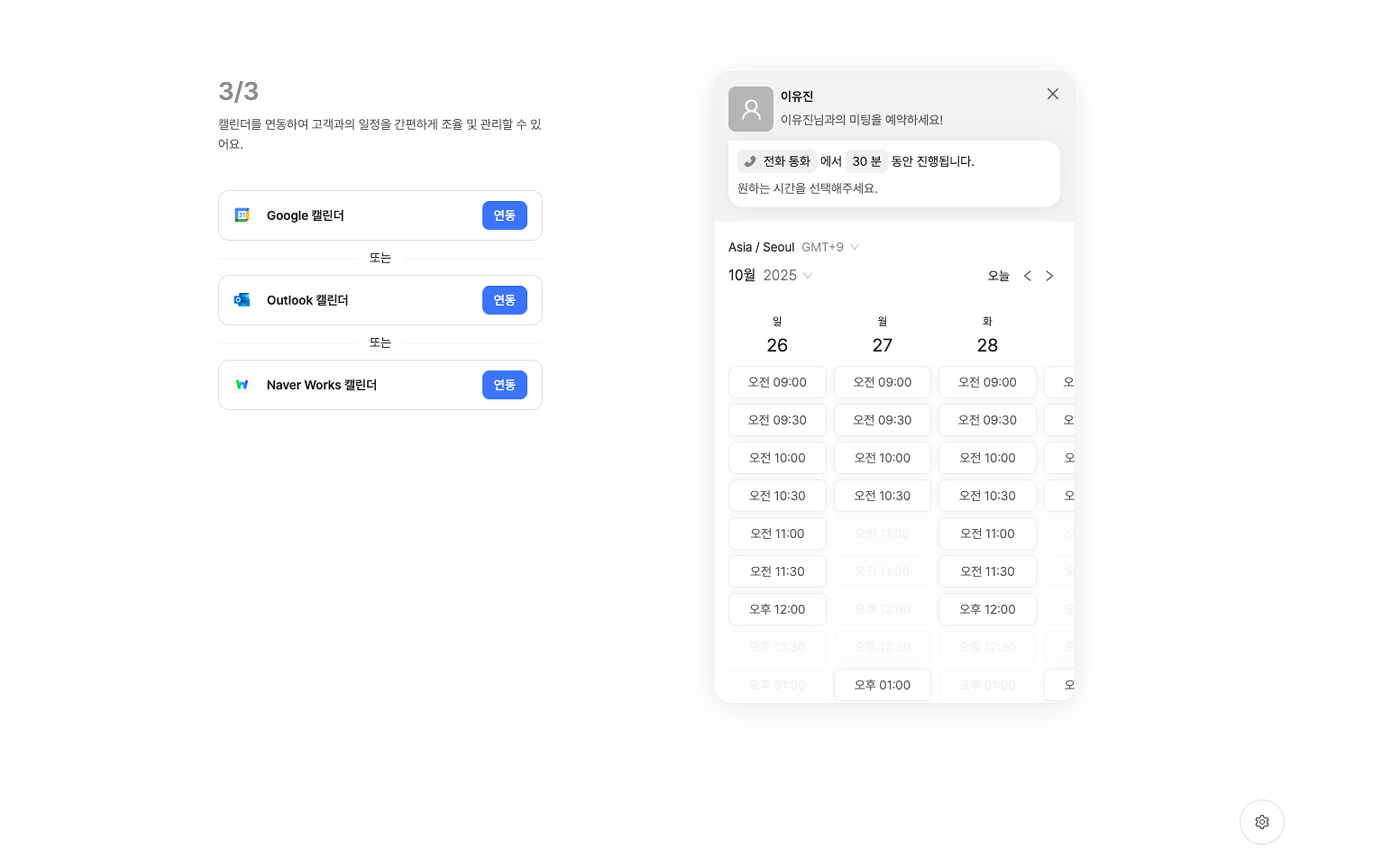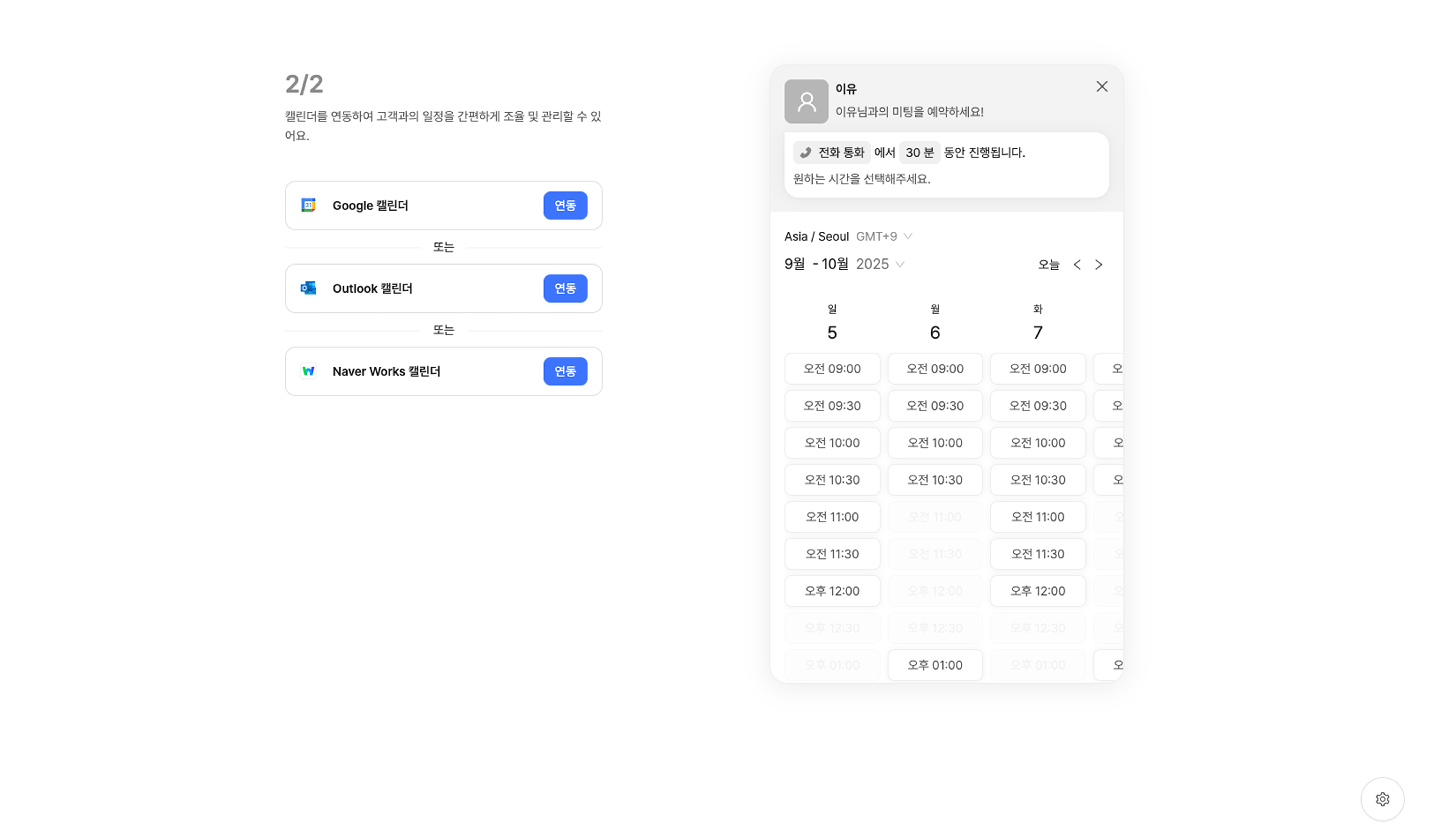 캘린더를 연결하여 미팅 일정을 손쉽게 확인할 수 있어요. 자동화된 일정 수립 프로세스로 미팅 일정을 효율적으로 관리해 보세요.