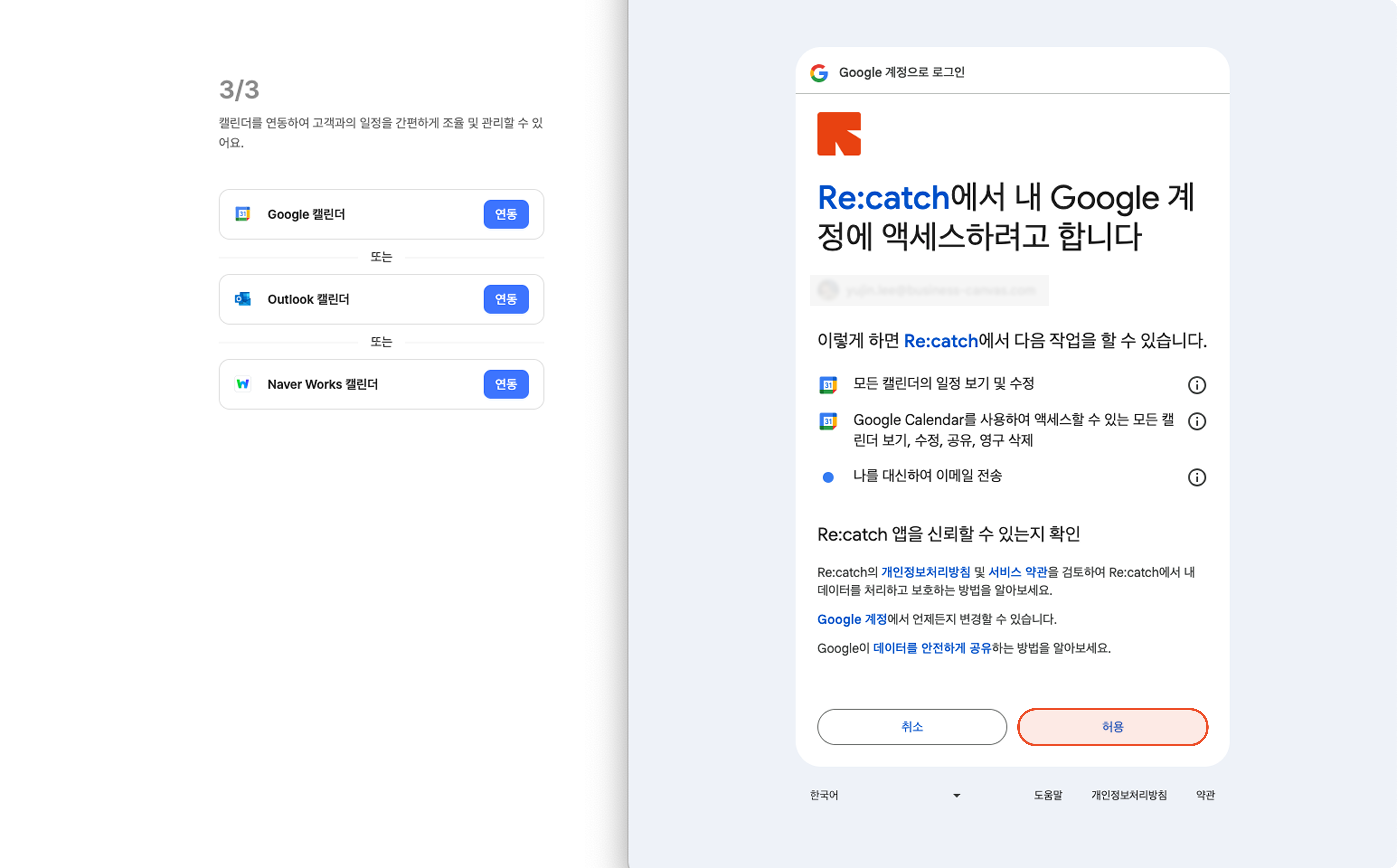 리캐치로 미팅 일정을 수립하고 일정 관리를 진행하기 위해서는 구글 캘린더 액세스 권한이 필요합니다.
