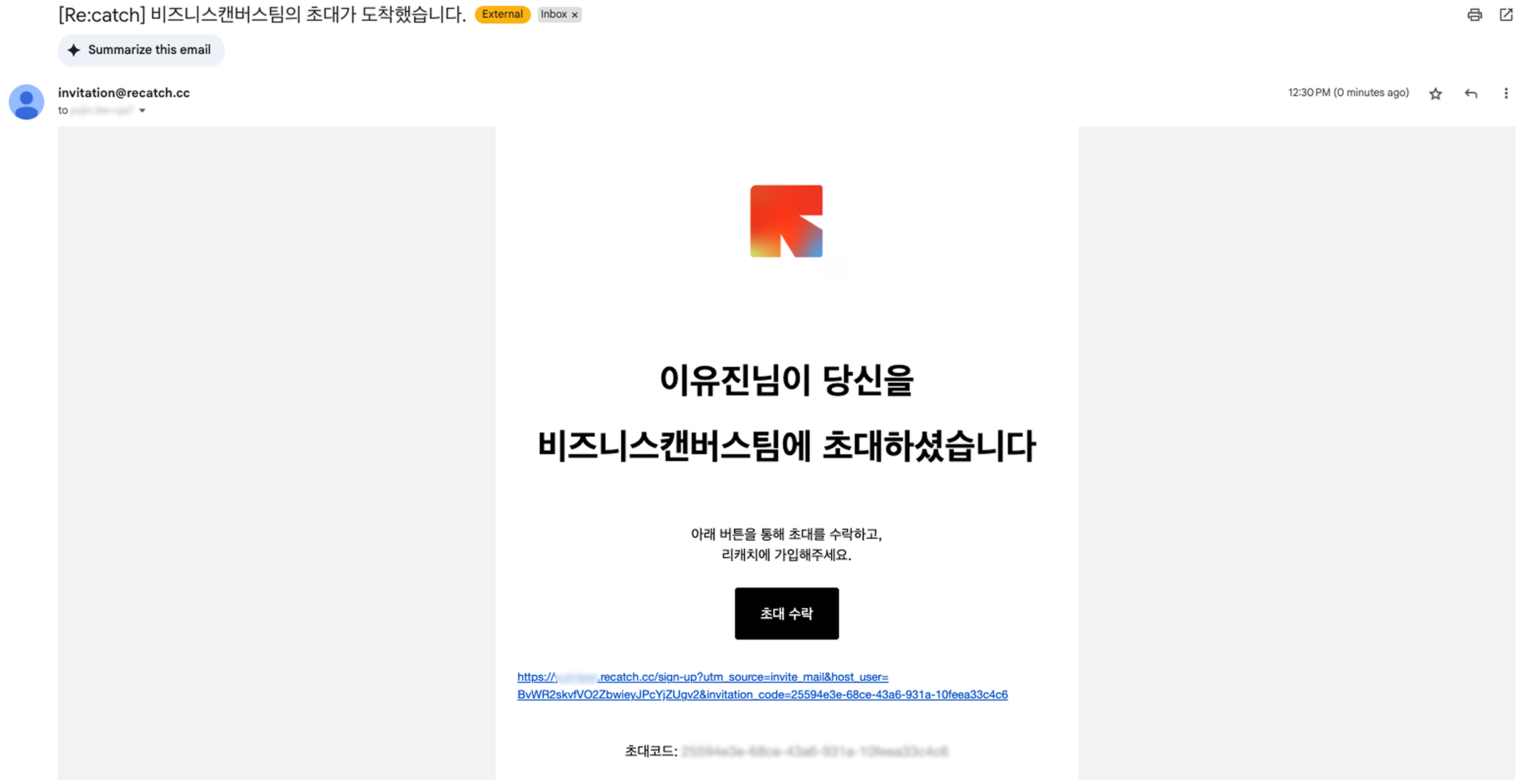 관리자(admin)가 전송한 초대 이메일의 링크를 통해 리캐치에 가입할 수 있습니다.