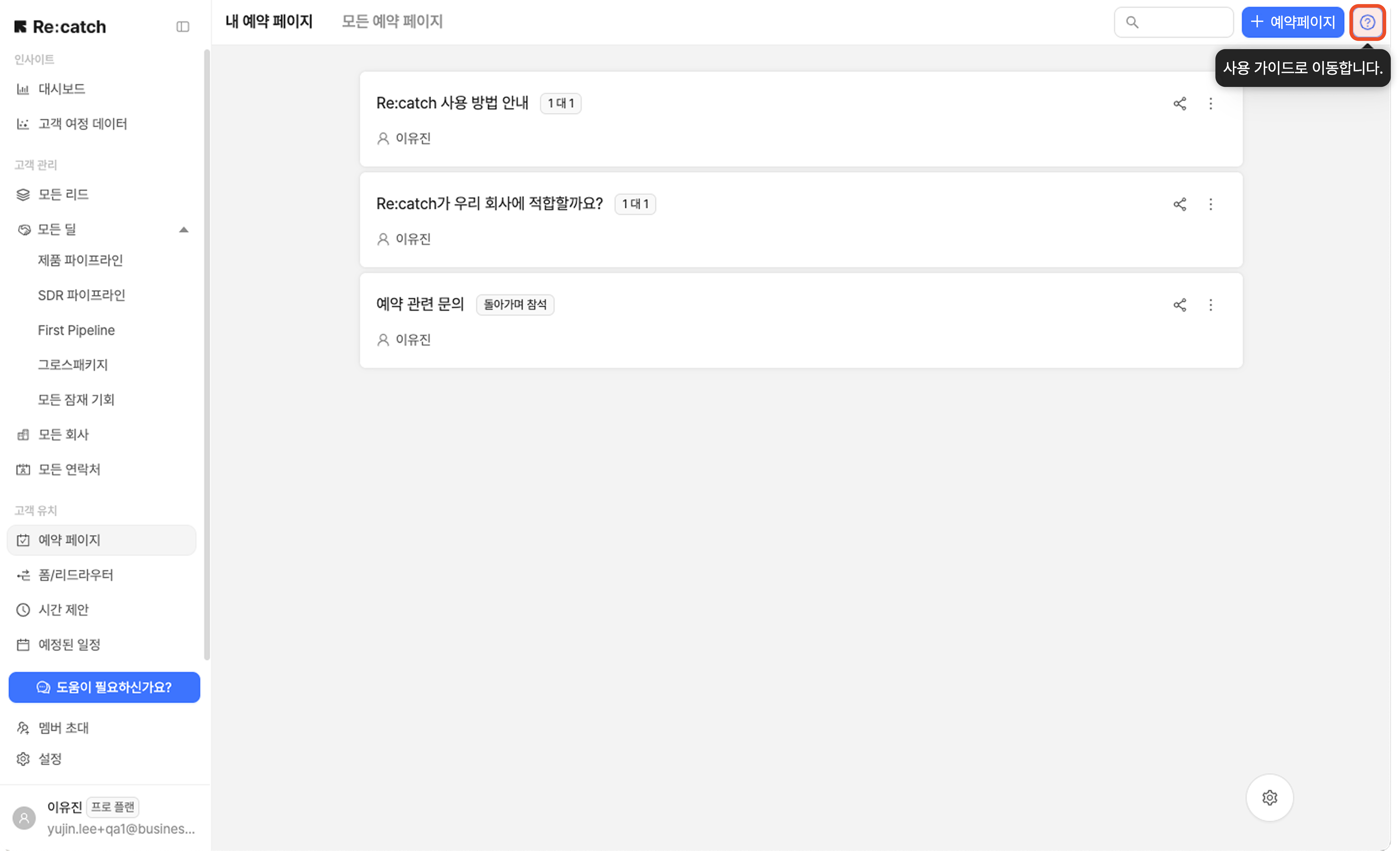 리캐치를 사용하시며 궁금한 점이 있으시다면, 물음표 모양의 가이드 버튼을 클릭해보세요.