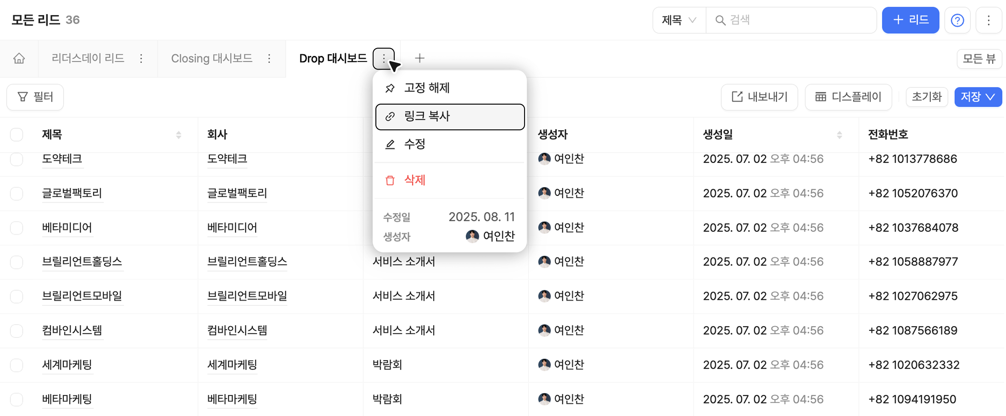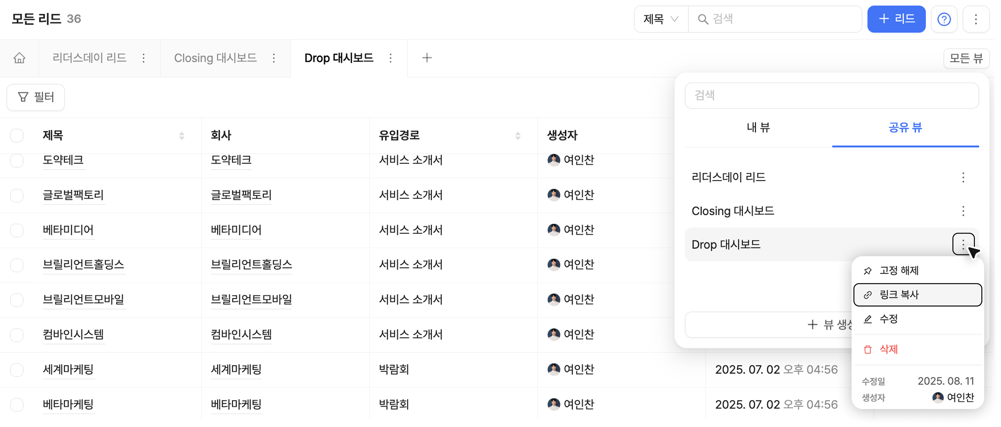 각 개체(리드, 딜, 회사, 연락처)별로 공유 뷰의 URL 링크를 복사해 팀원에게 공유할 수 있습니다.