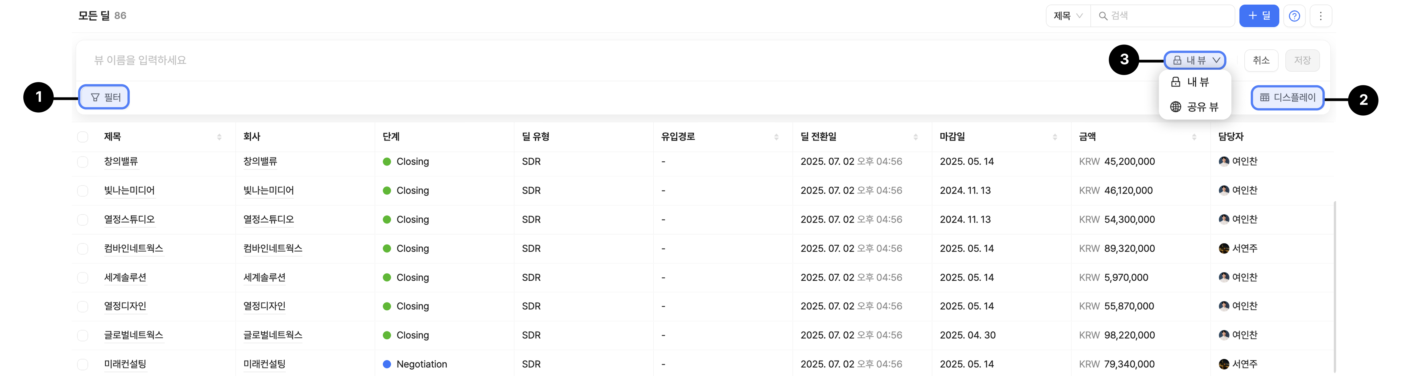 모든 리드 또는 딜 페이지 우측 상단의 '모든 뷰' - '뷰 생성'을 클릭하여 뷰를 생성할 수 있습니다.