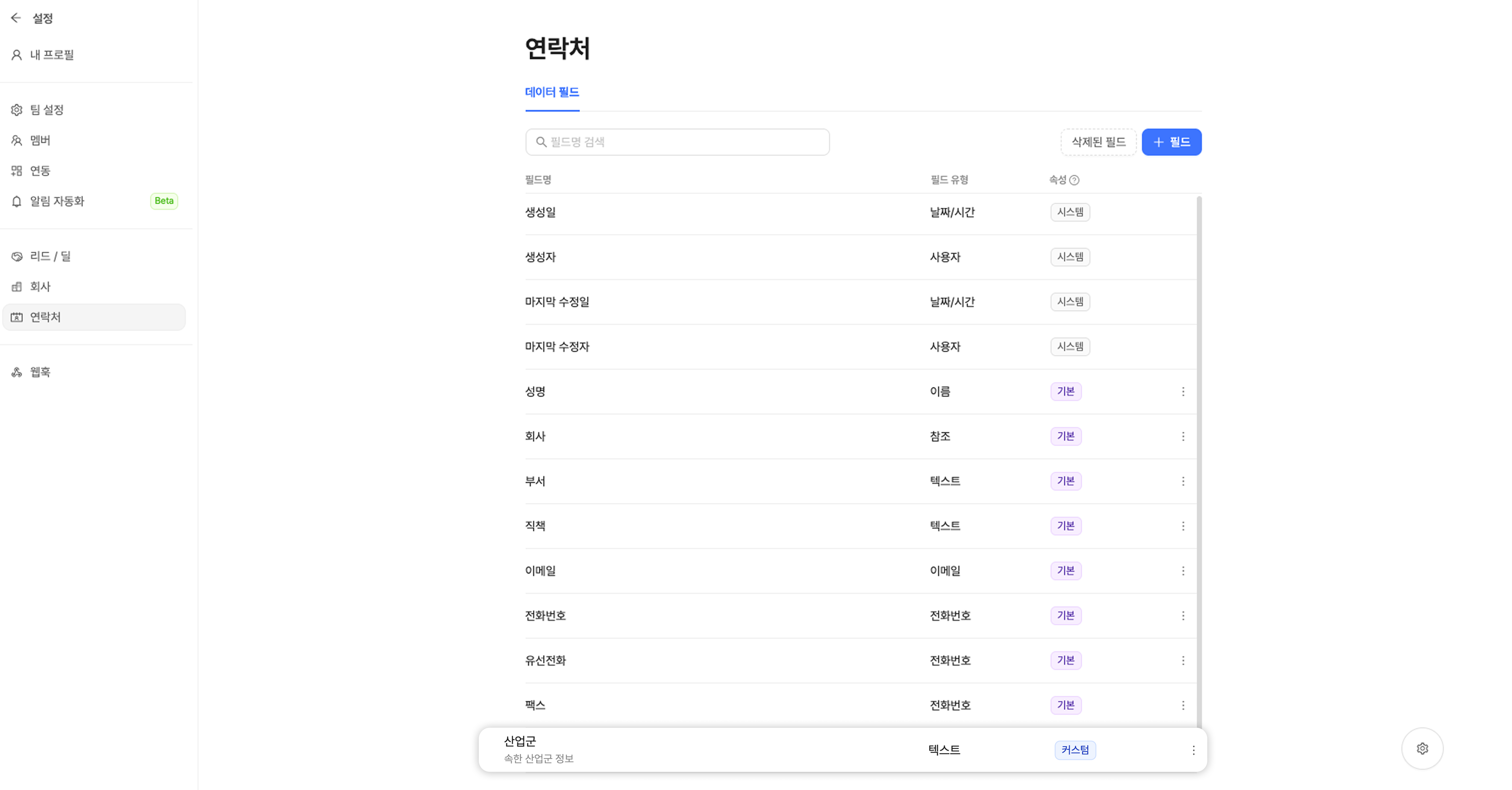 연락처에 필드를 추가하고 싶다면, '설정'-'연락처' 탭에서 '+필드' 버튼을 클릭해 커스텀 필드를 추가할 수 있습니다.