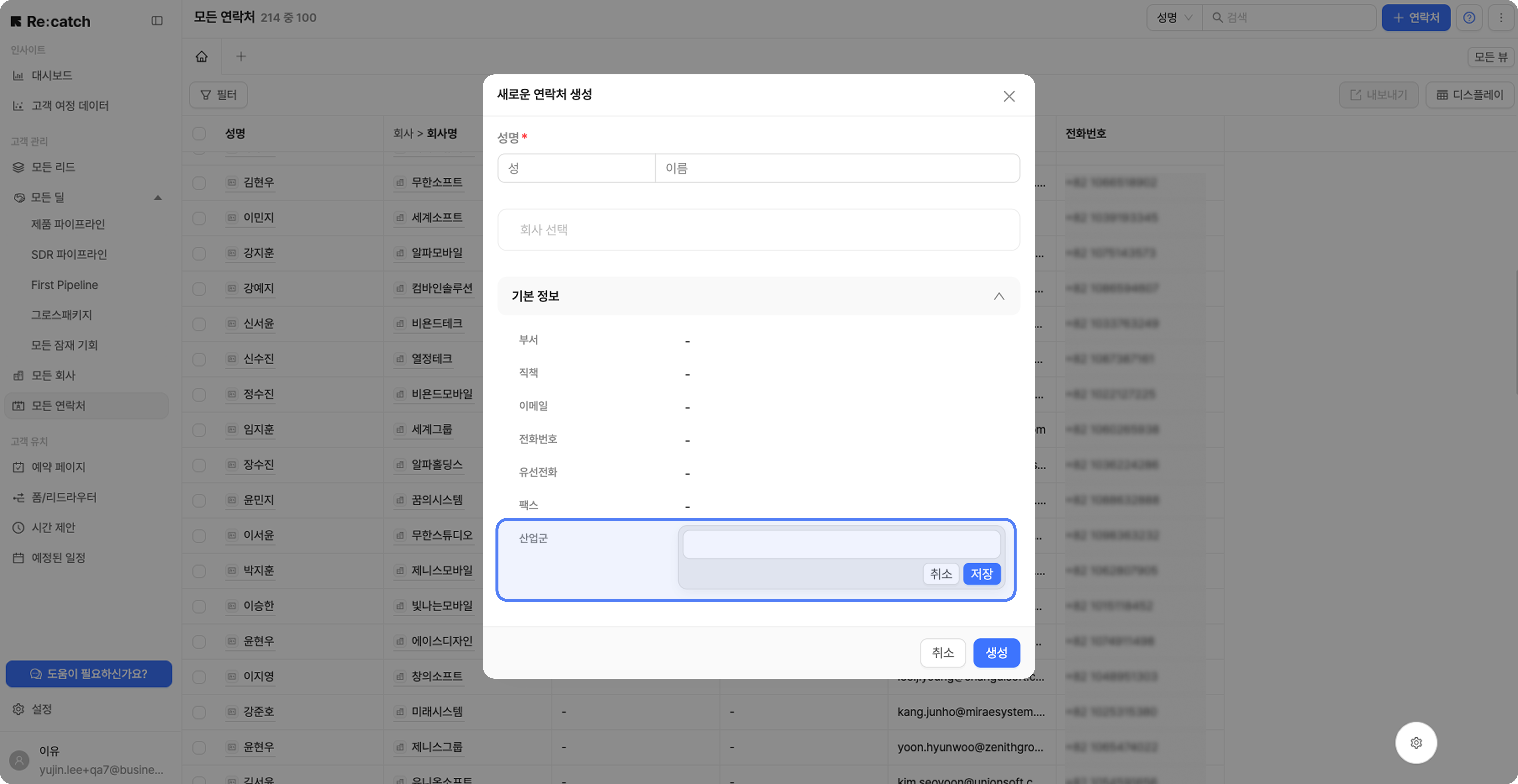 설정 후에는 '모든 연락처'에서 연락처를 생성할 때에도 추가한 커스텀 필드를 바로 입력할 수 있습니다.