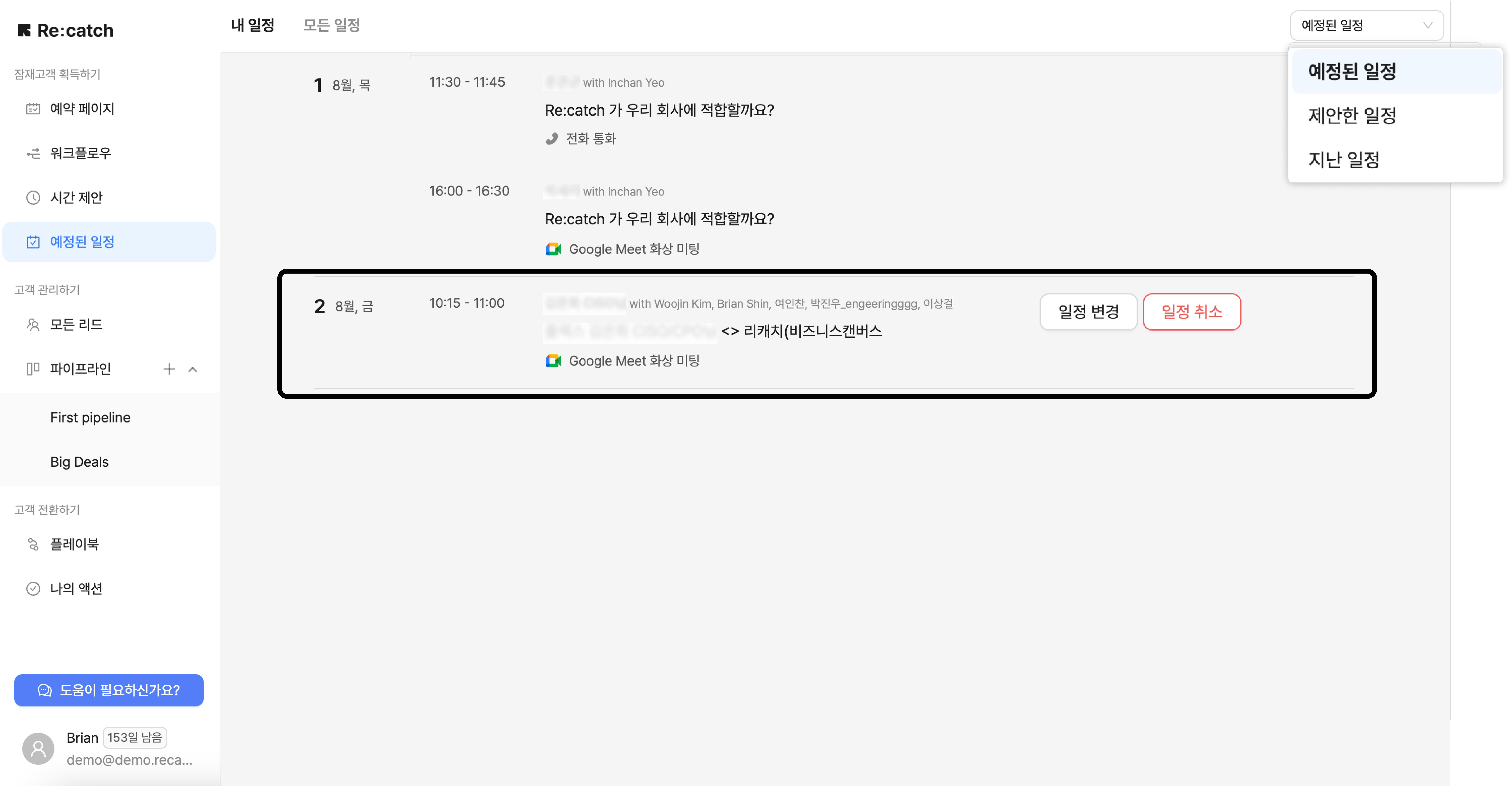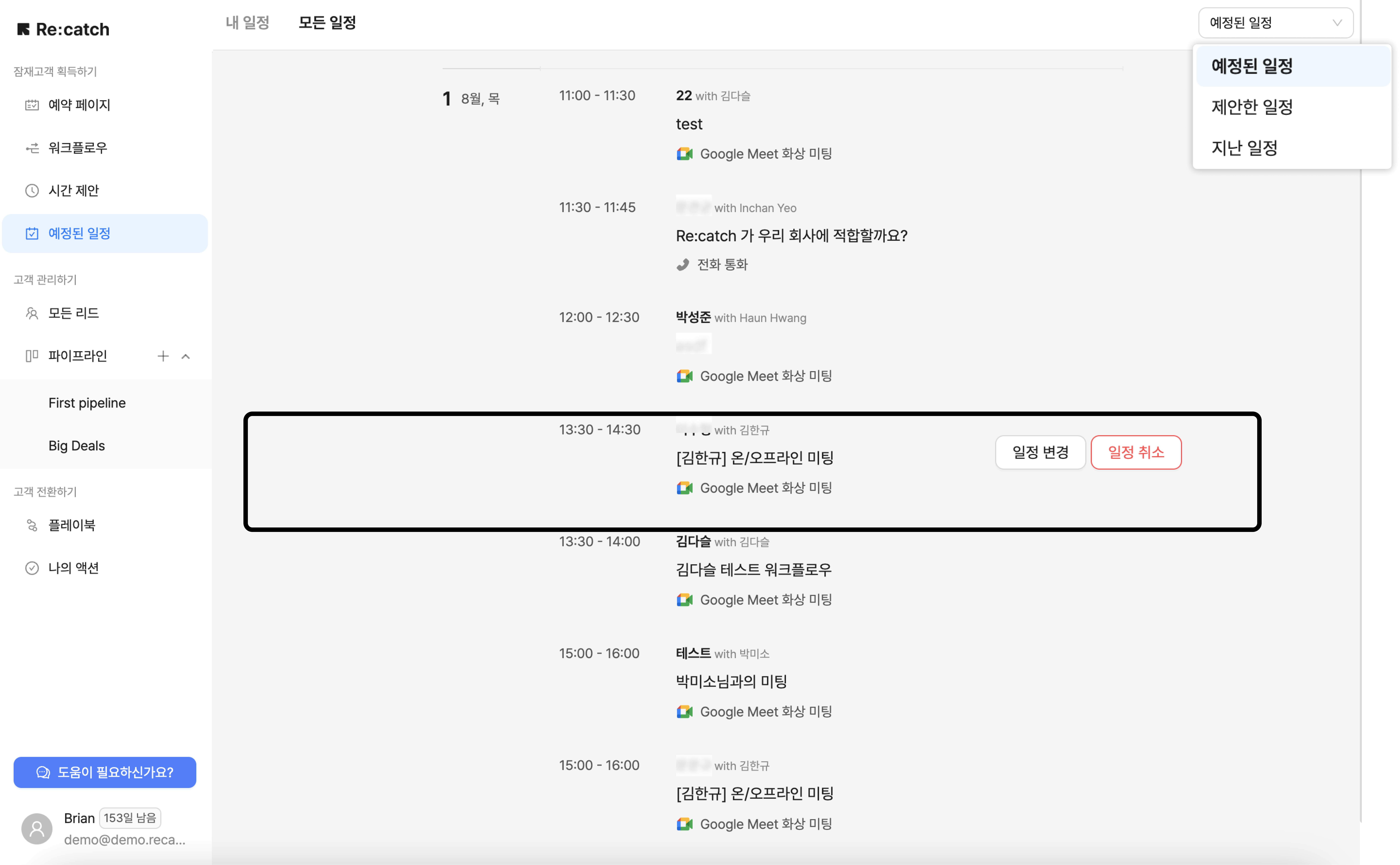 리캐치 예정된 일정에서 내 일정과 모든 일정을 한눈에 파악하여 일정을 손쉽게 관리해보세요