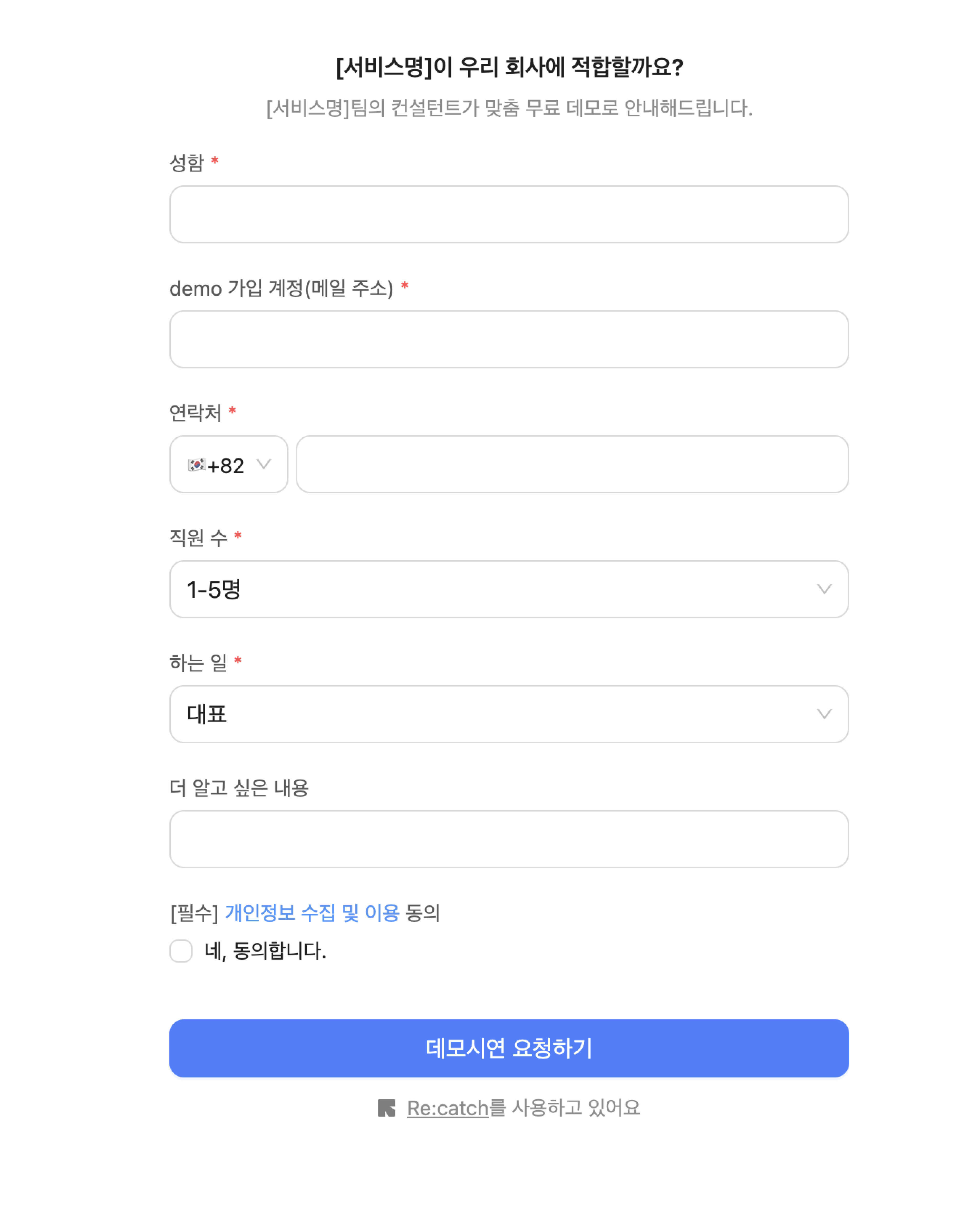 리캐치 홈페이지의 [도입문의 버튼]처럼 웹페이지가 아닌 버튼에 링크를 넣을 때 UTM 링크로 만들어 삽입하실 수 있습니다.
