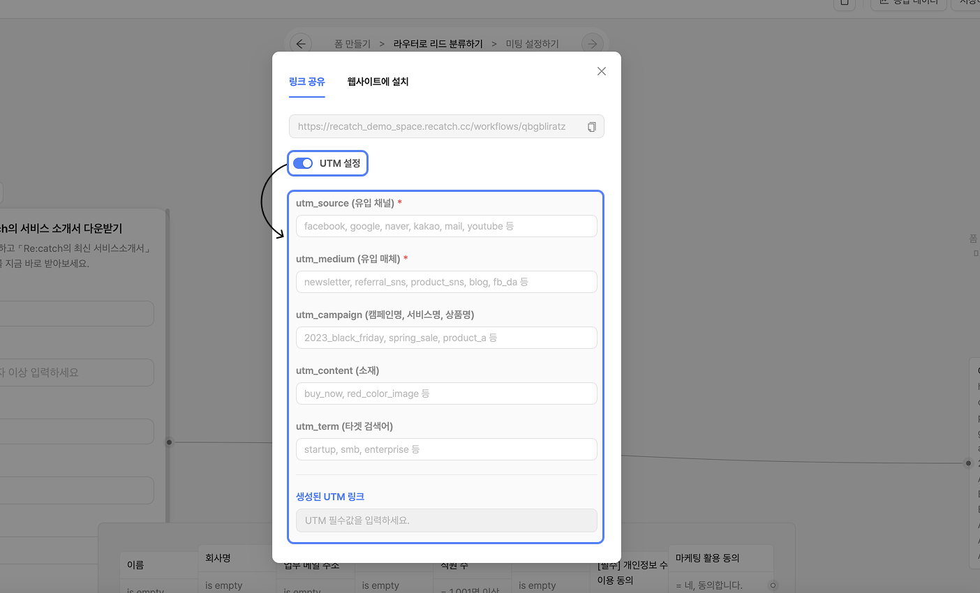 링크 공유시 UTM 설정 토글을 키면 공유하려는 리캐치폼에 대한 UTM을 설정할 수 있어요.