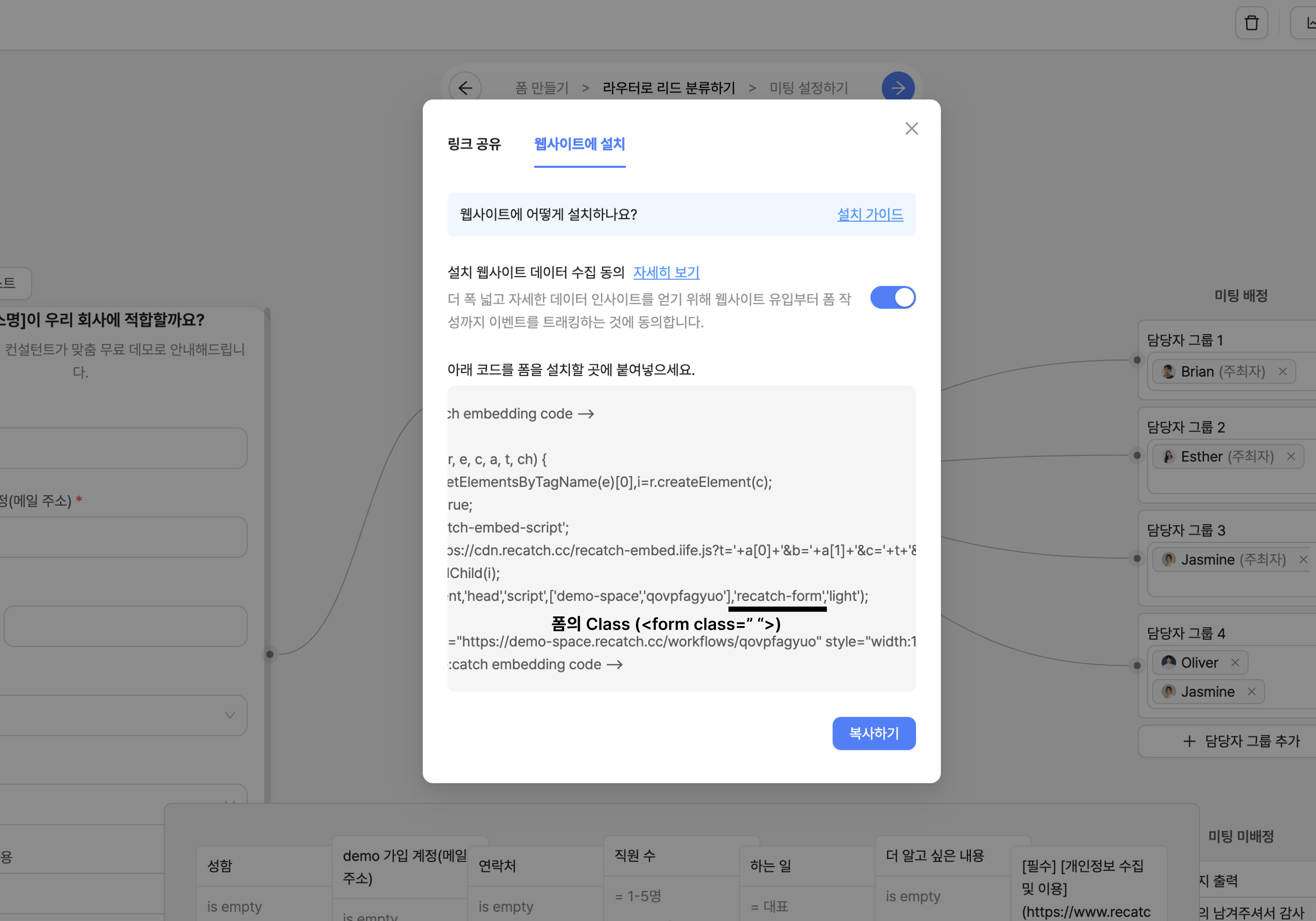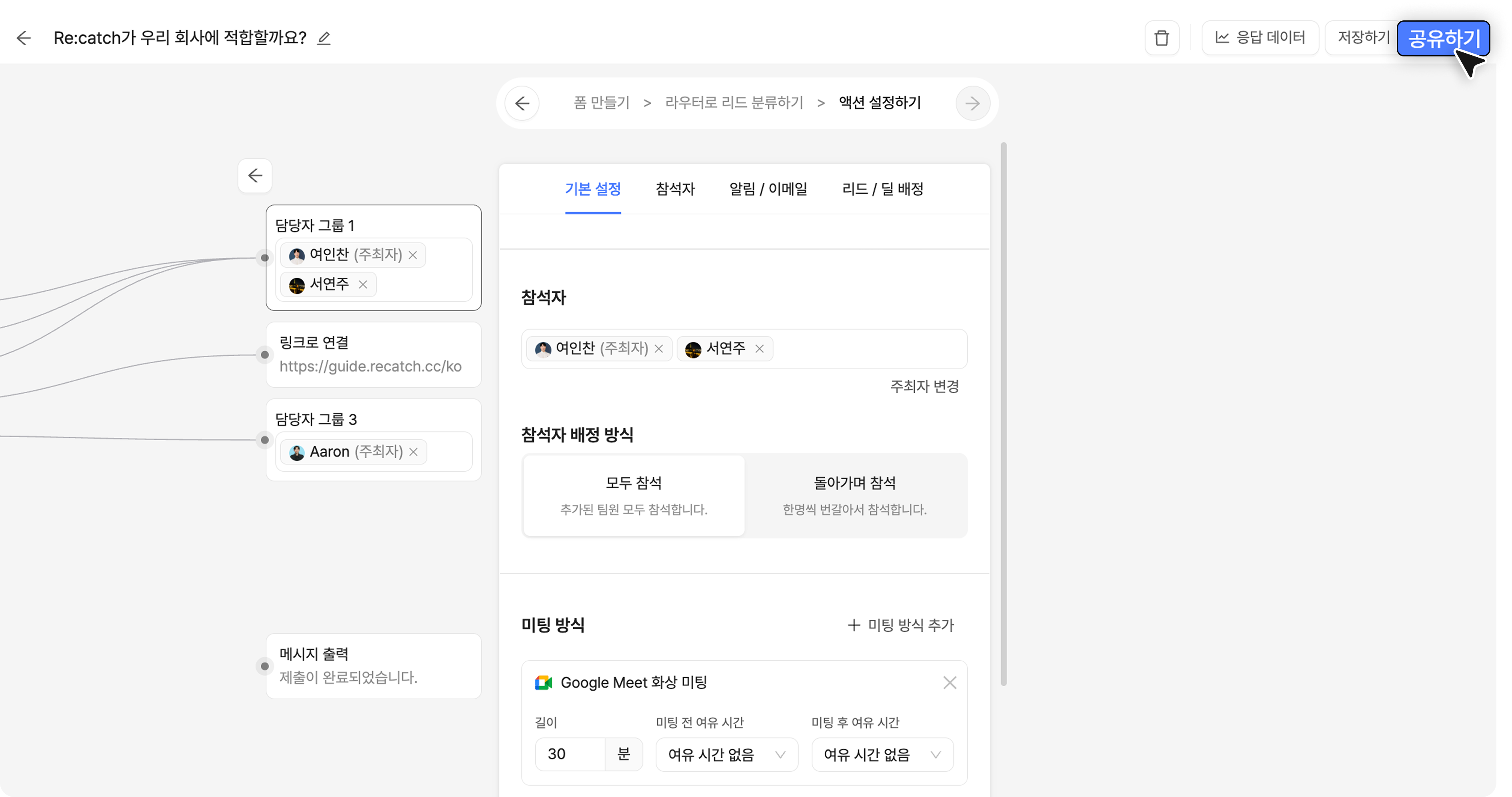 우측 상단에 있는 '공유하기' 버튼을 클릭해보세요. 링크를 공유하거나 웹사이트에 리캐치폼을 설치할 수 있어요.