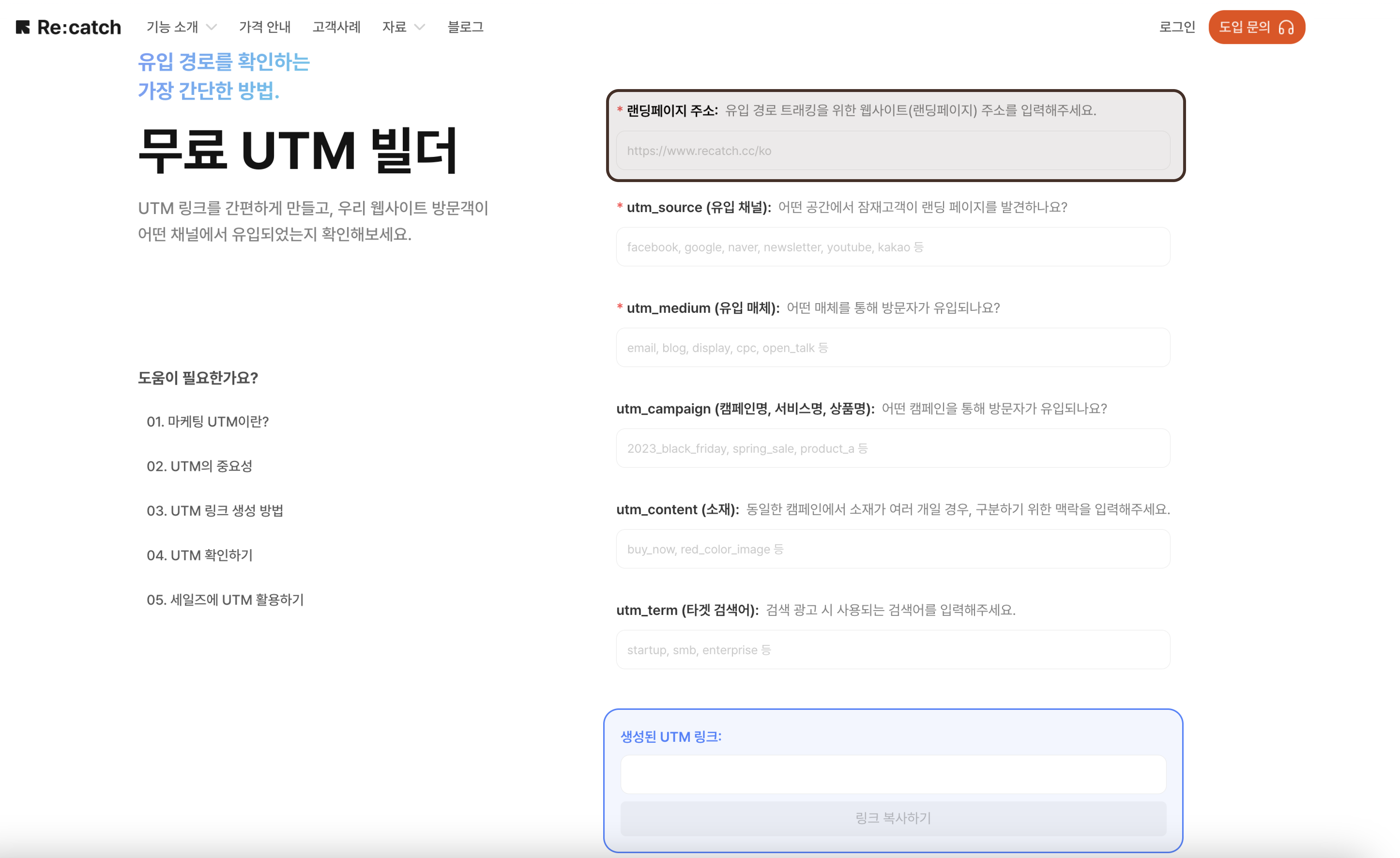 리캐치에서 제공하는 무료 UTM 빌더(클릭)를 활용하여 UTM 링크를 간편하게 만들 수 있어요.