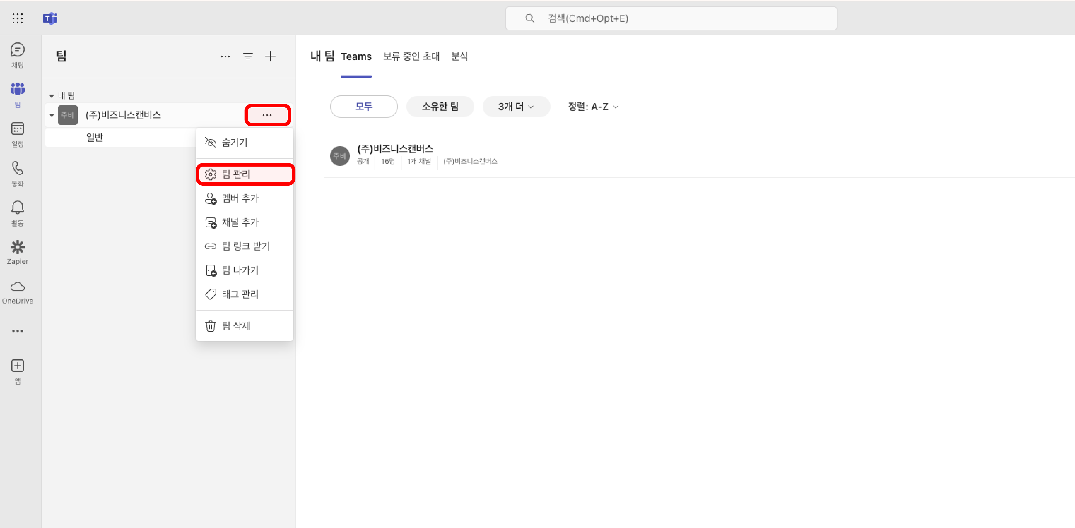 팀 우측의 더보기 - '팀 관리'를 클릭해주세요.