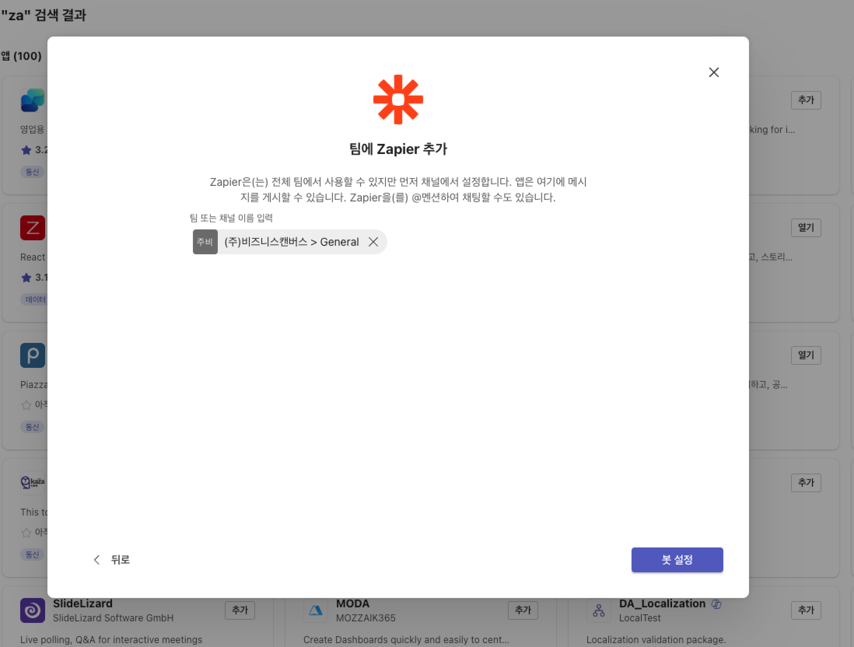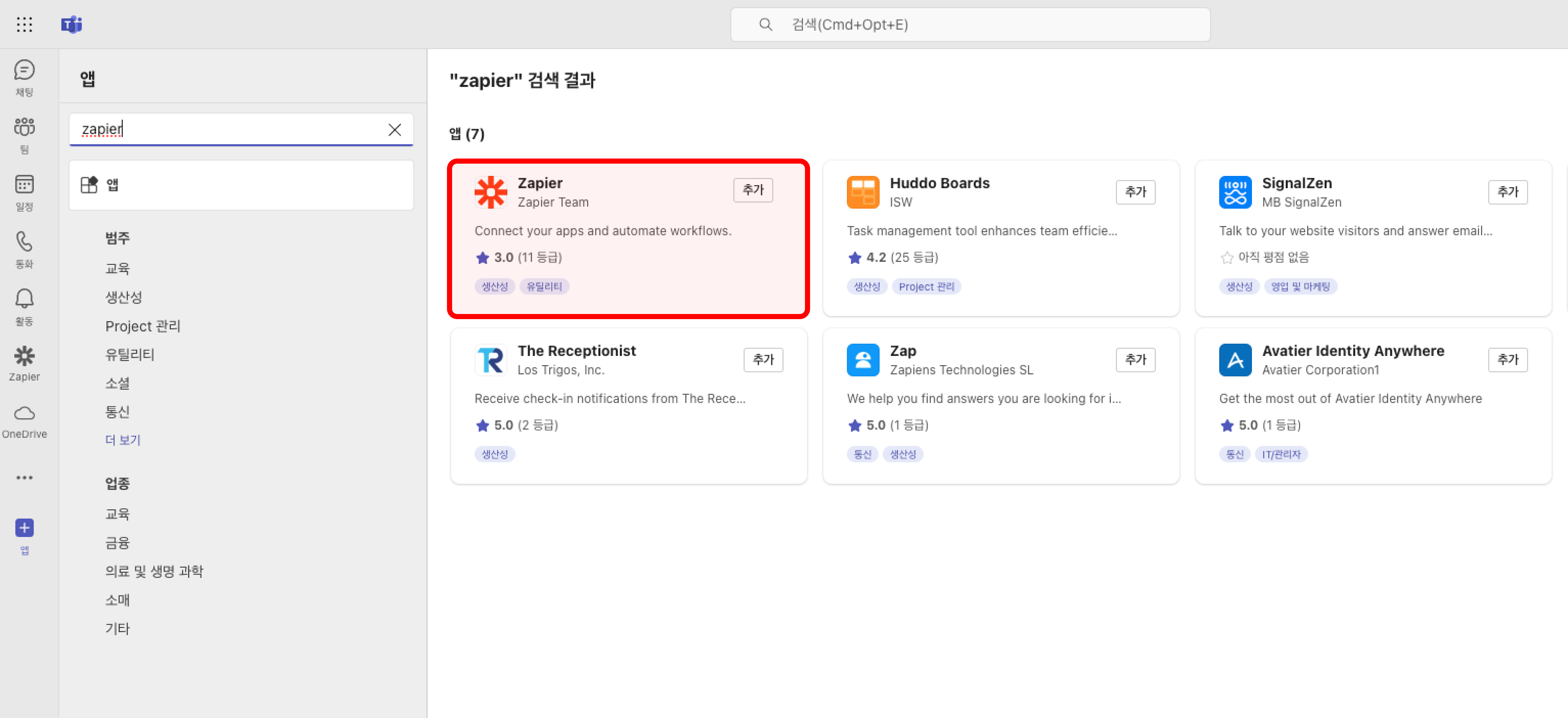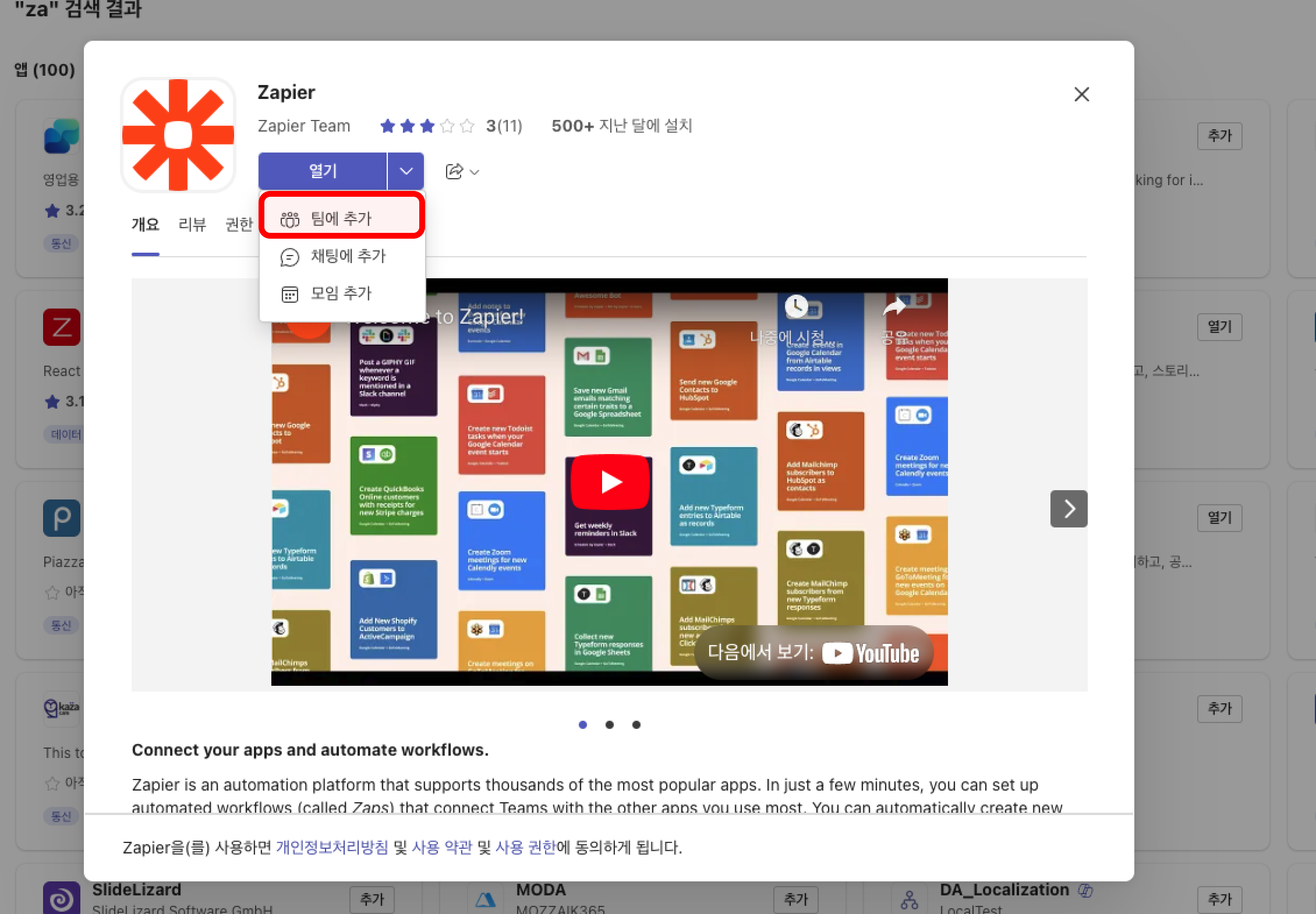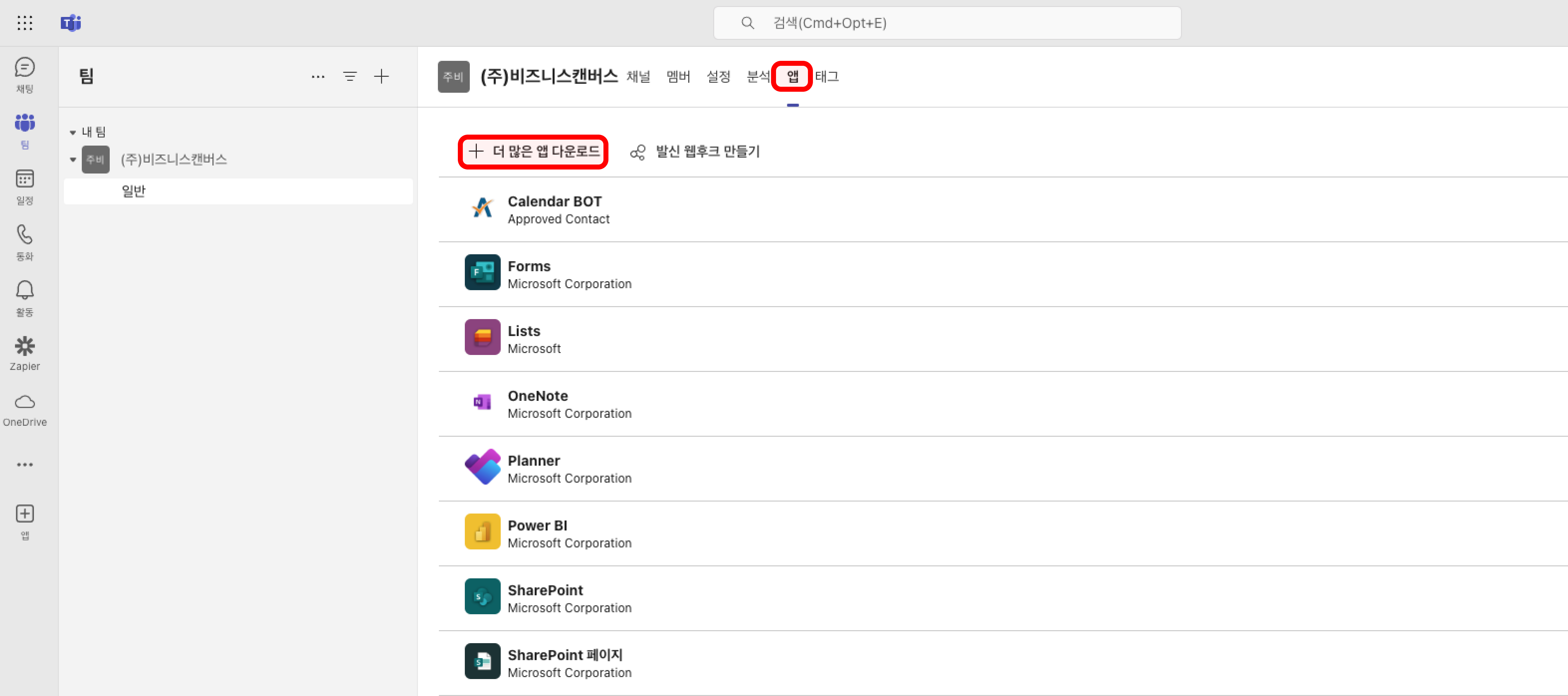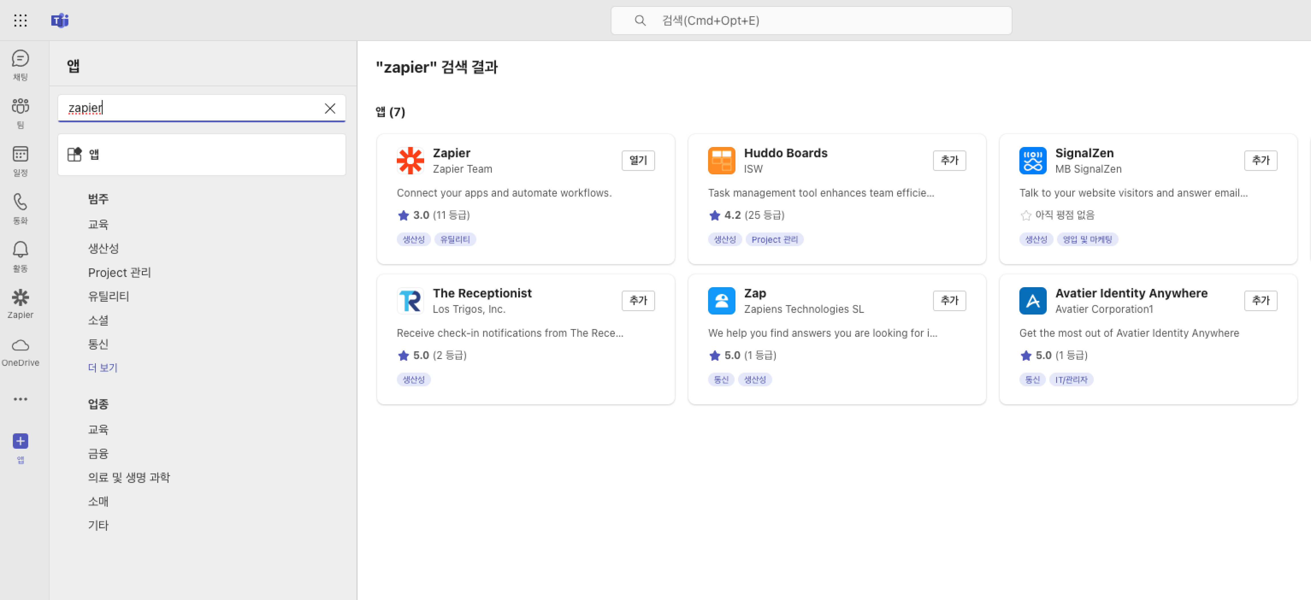 → 팀즈에서 자피어 다운로드 시 '팀에 추가'로 자피어를 다운로드한게 맞는지 확인해주세요.