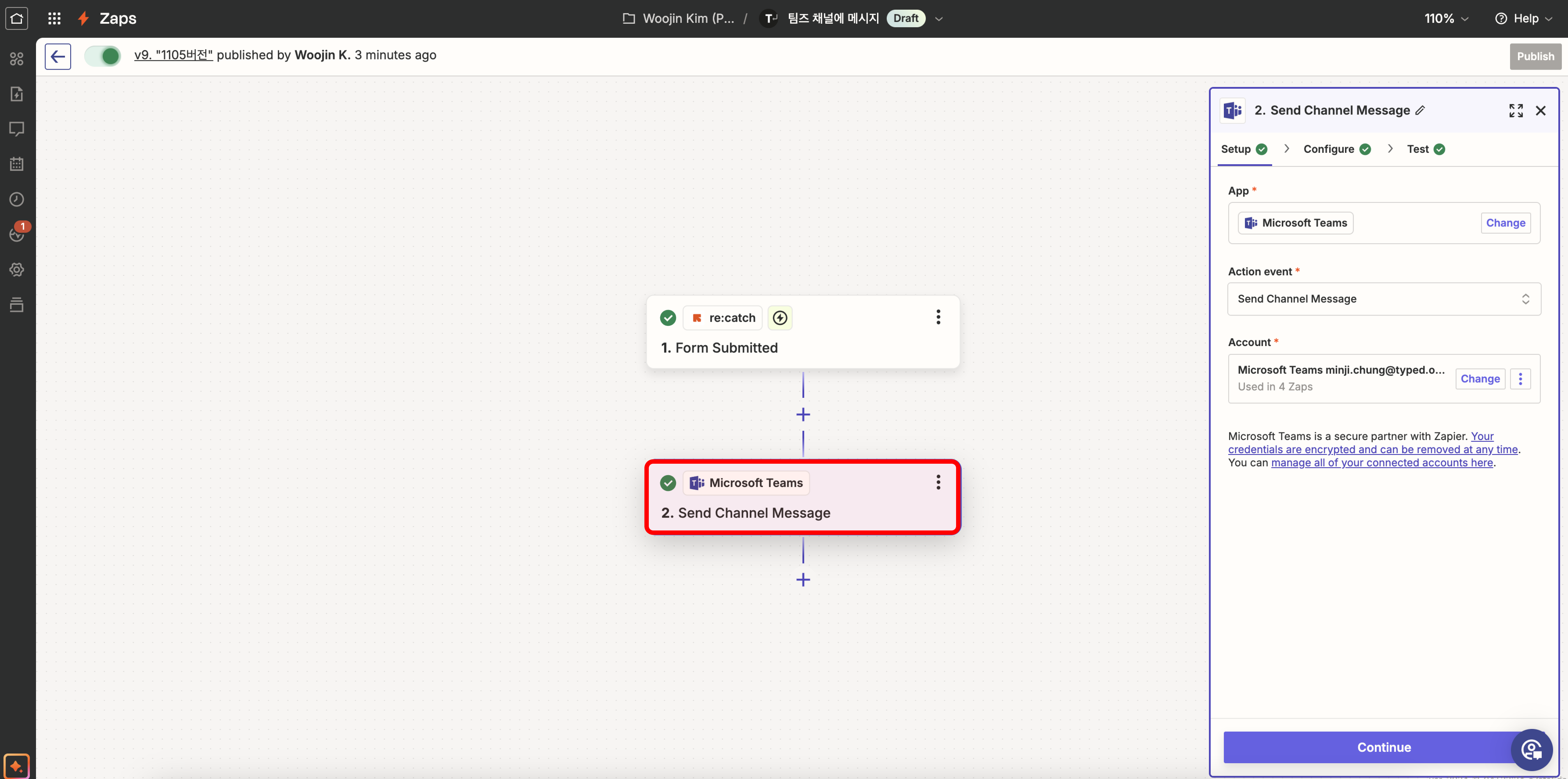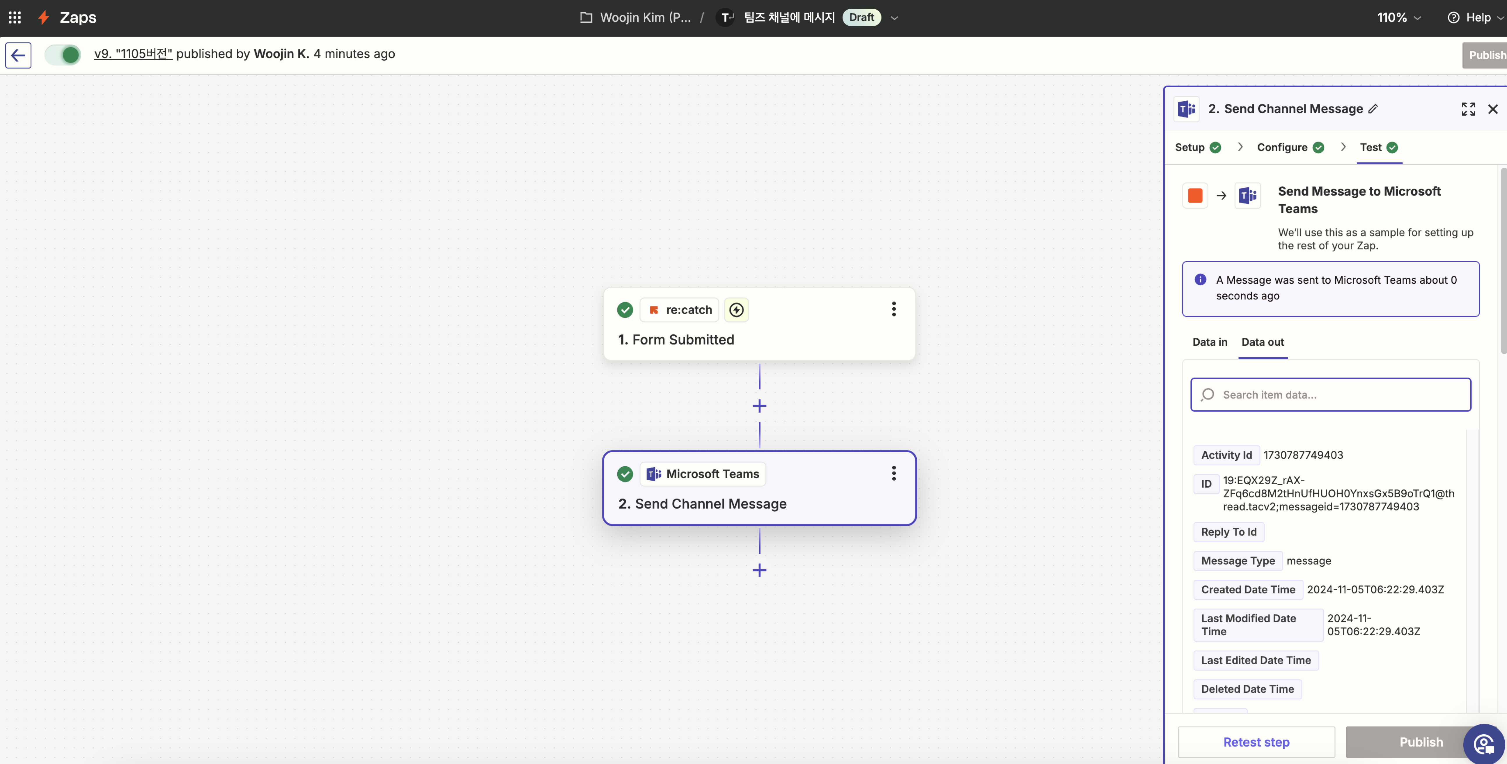 publish 하면 아래 예시 이미지와 같이 폼이 제출되었을 때 팀즈에서 메시지를 받을 수 있습니다.