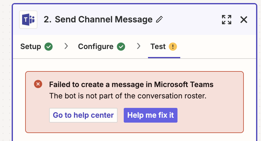 테스트 진행 시 ' Failed to create a message in Microsoft Teams. The bot is not part of the conversation roster. ' 라는 오류 메시지가 나타난다면