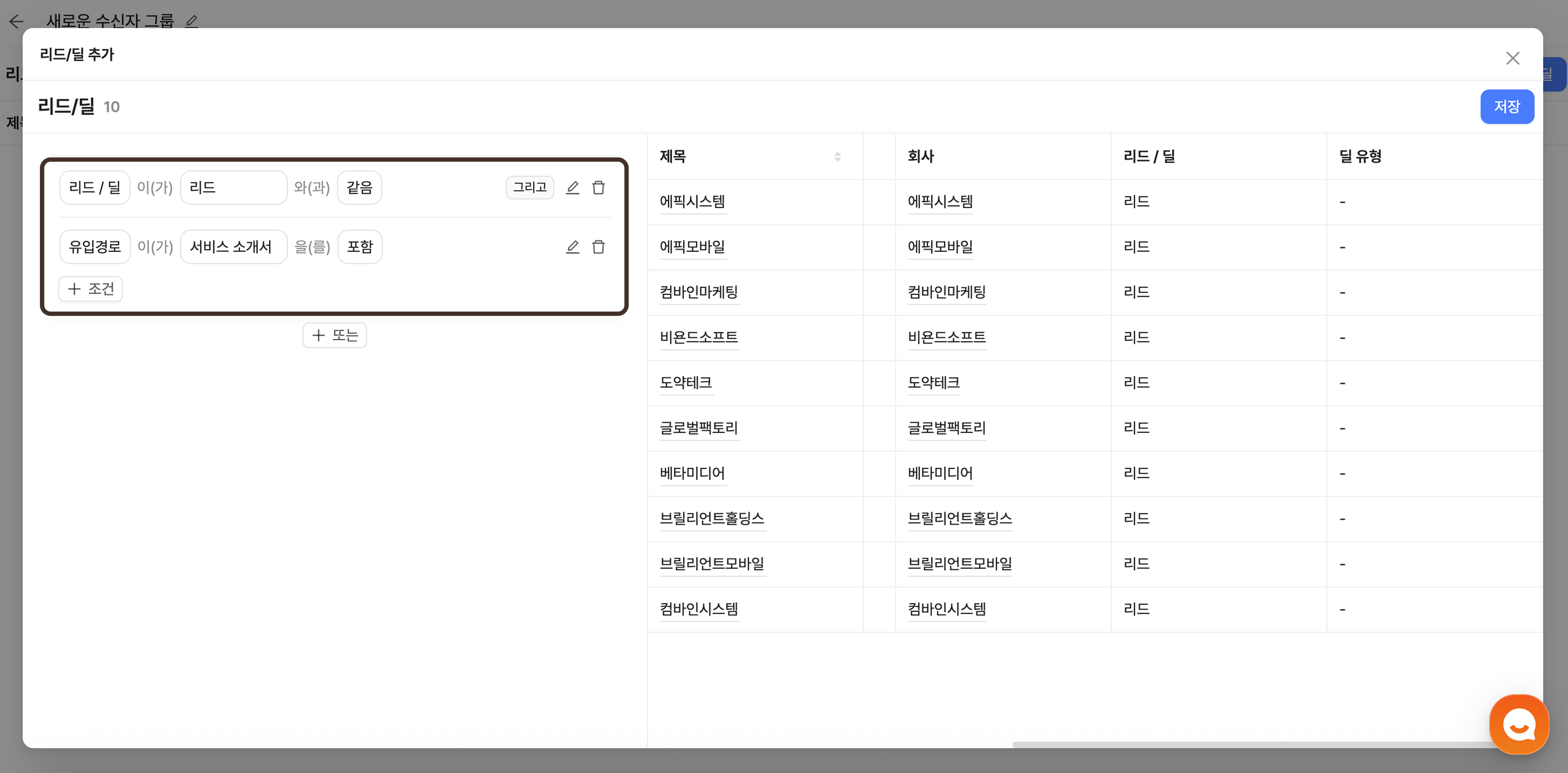 +리드/딜’ 버튼을 눌러 필터를 설정해 주세요.‘조건’을 클릭하여 조건을 설정해 주세요. 검색을 통해서도 바로 추가할 수 있습니다.