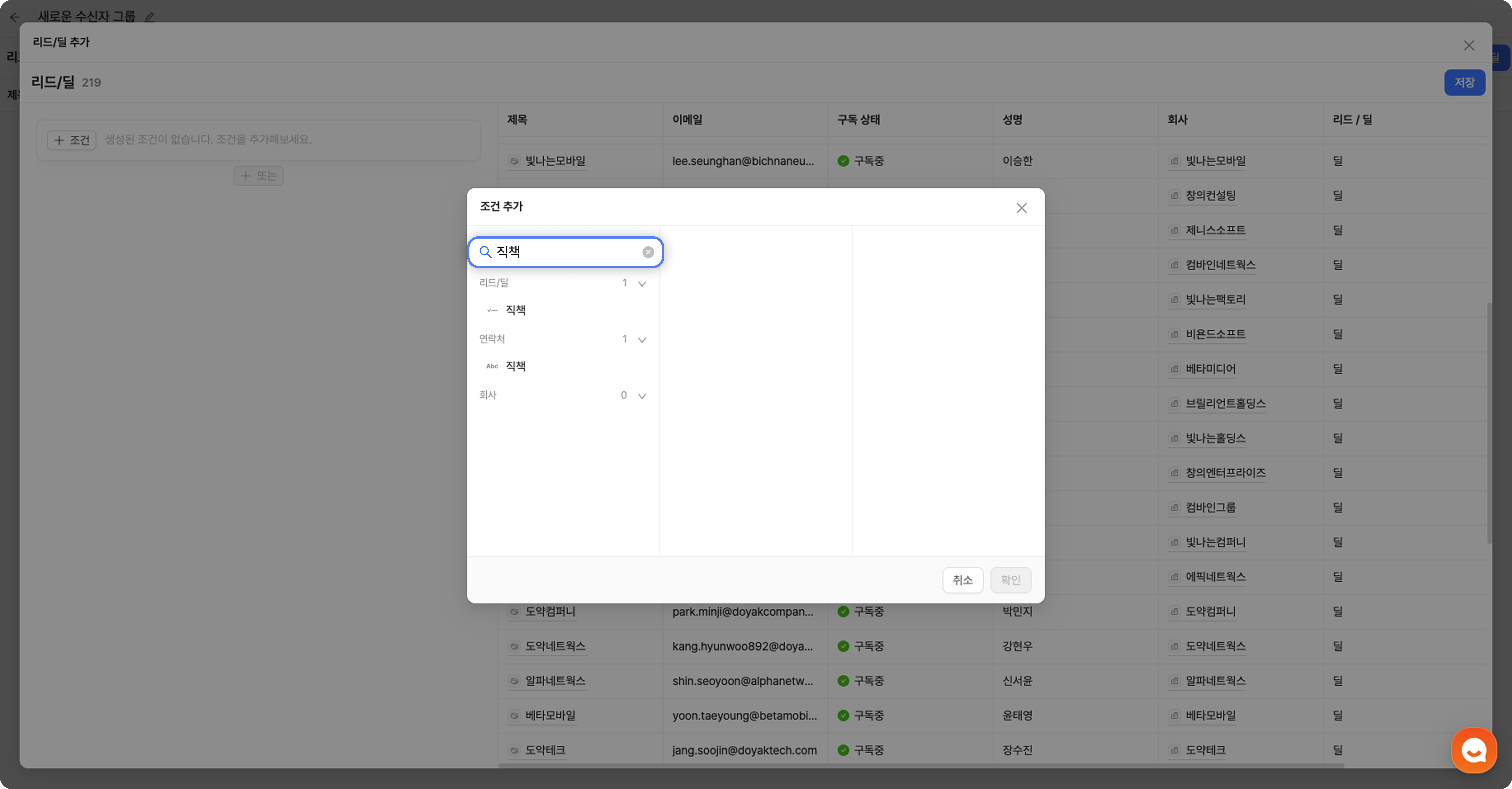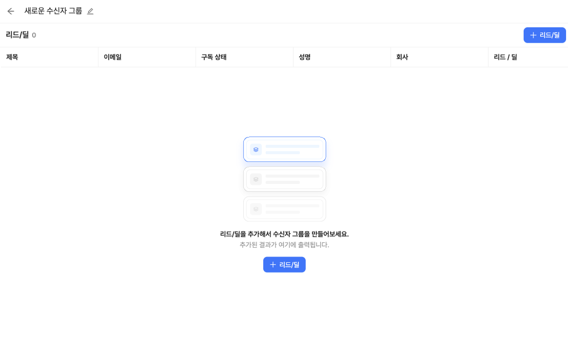 수신자 그룹은 이메일을 발송할 대상의 목록이에요. 리캐치에 저장된 리드/딜을 원하는 조건으로 필터링하여 내 캠페인에 딱 맞는 수신자 그룹을 만들 수 있어요.
