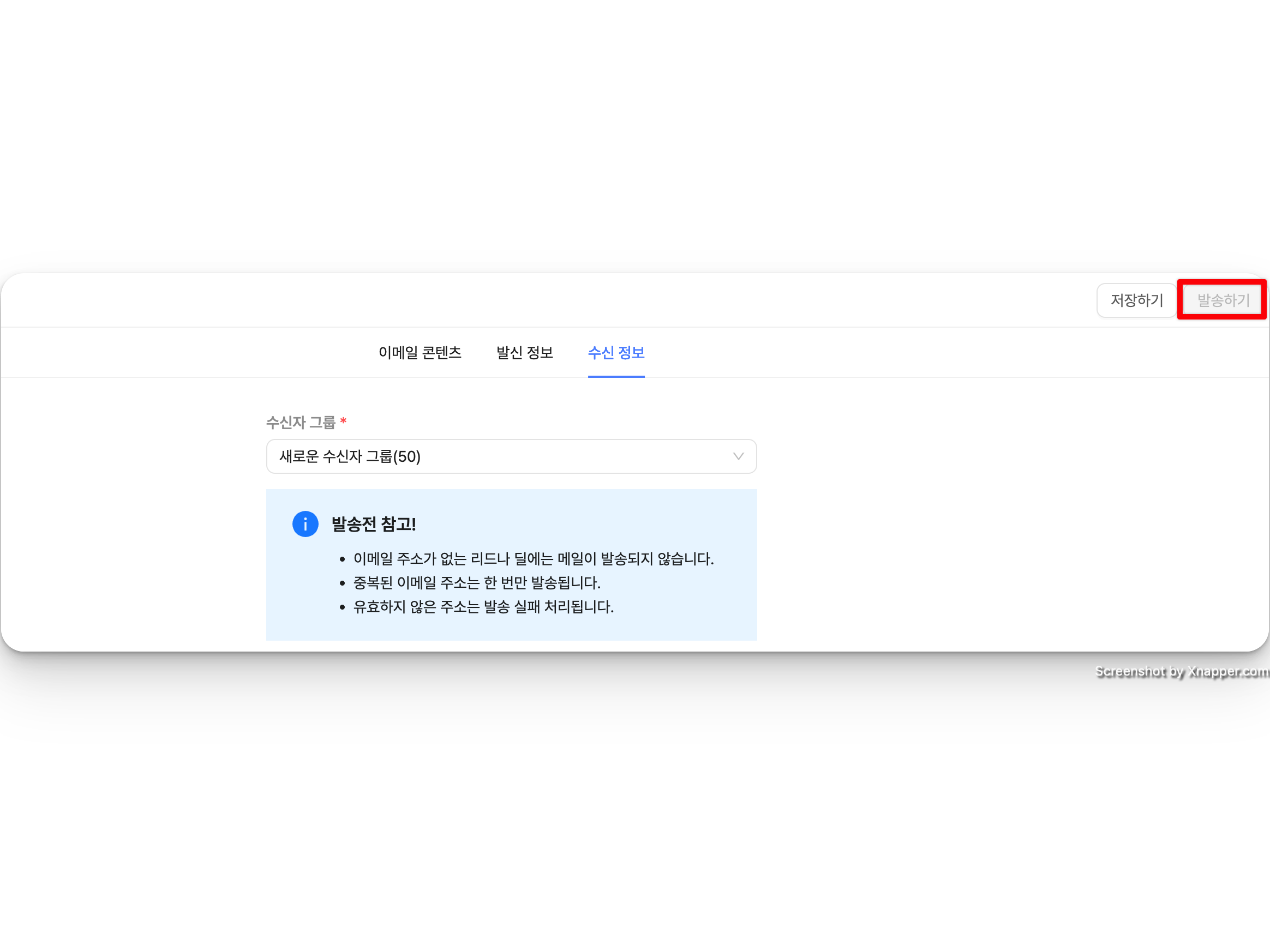 이메일 캠페인 기능에서 콘텐츠, 발신 정보, 수신 정보를 설정해주신 다음 '발송하기'를 클릭하면 이메일이 발송됩니다.